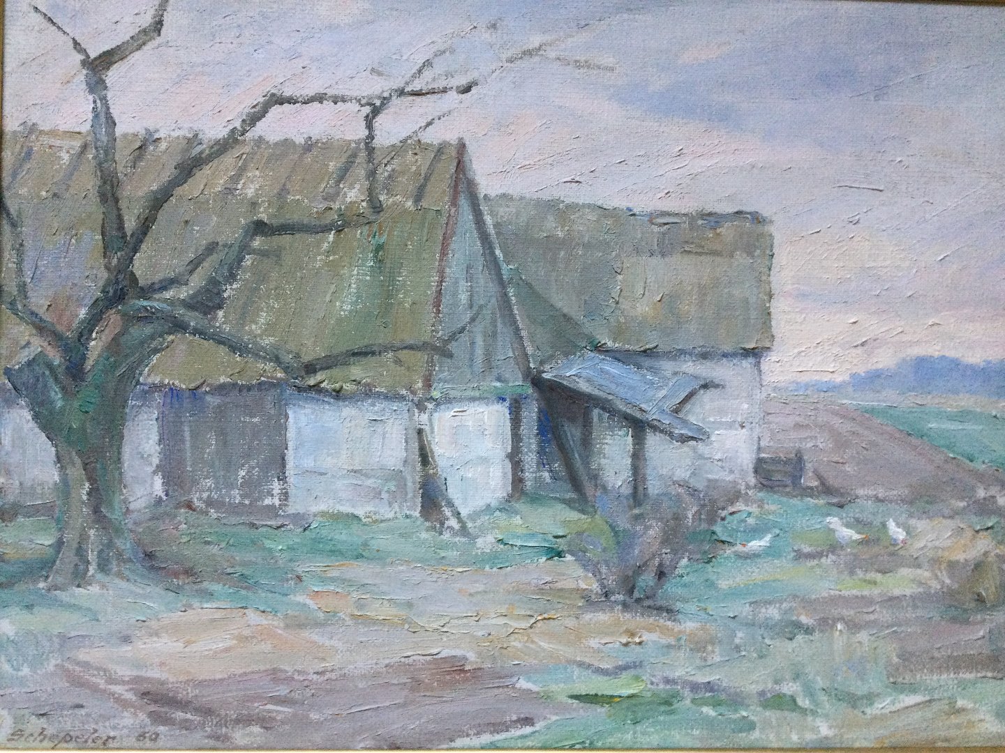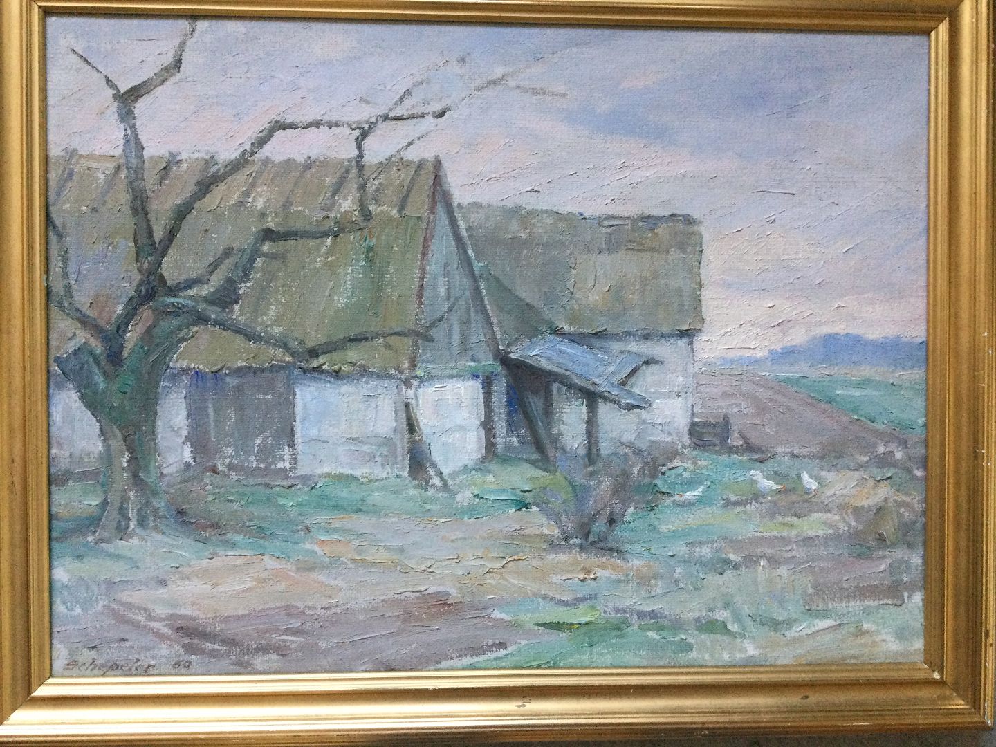 Maleri af Johan Frederik Georg Schepeler 1950 - Gårdsplads med høns.