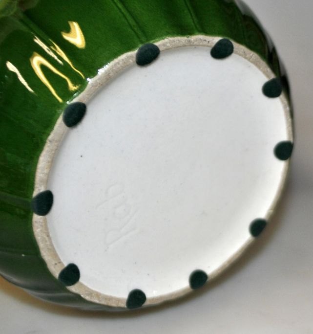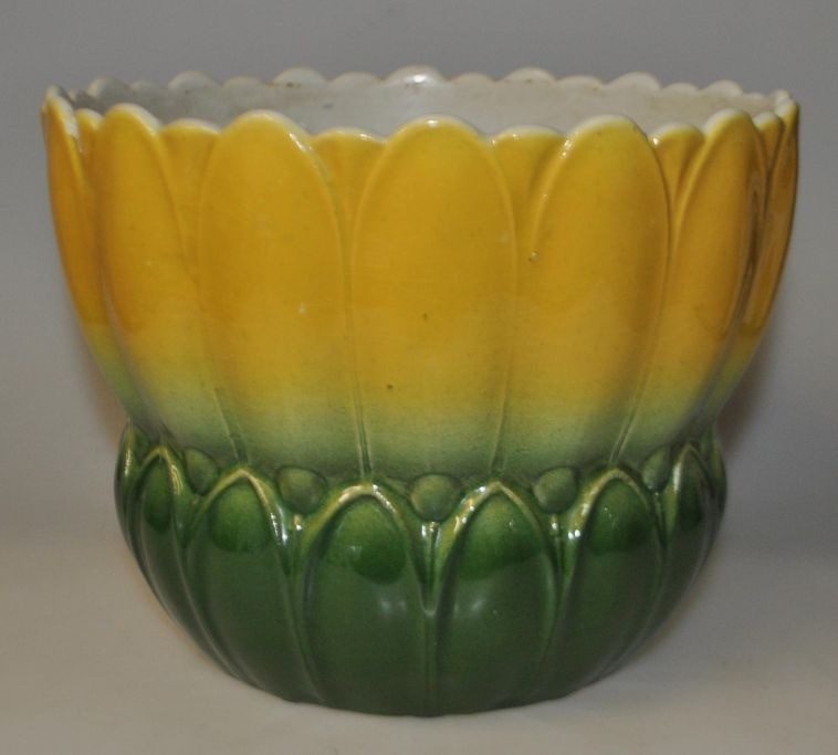 Majolica urtepotte 1880 - 1900. Tyskland. Gul, grøndekoreret med mønstre. Højde.: 14,5 cm. Stemplet: RAB.