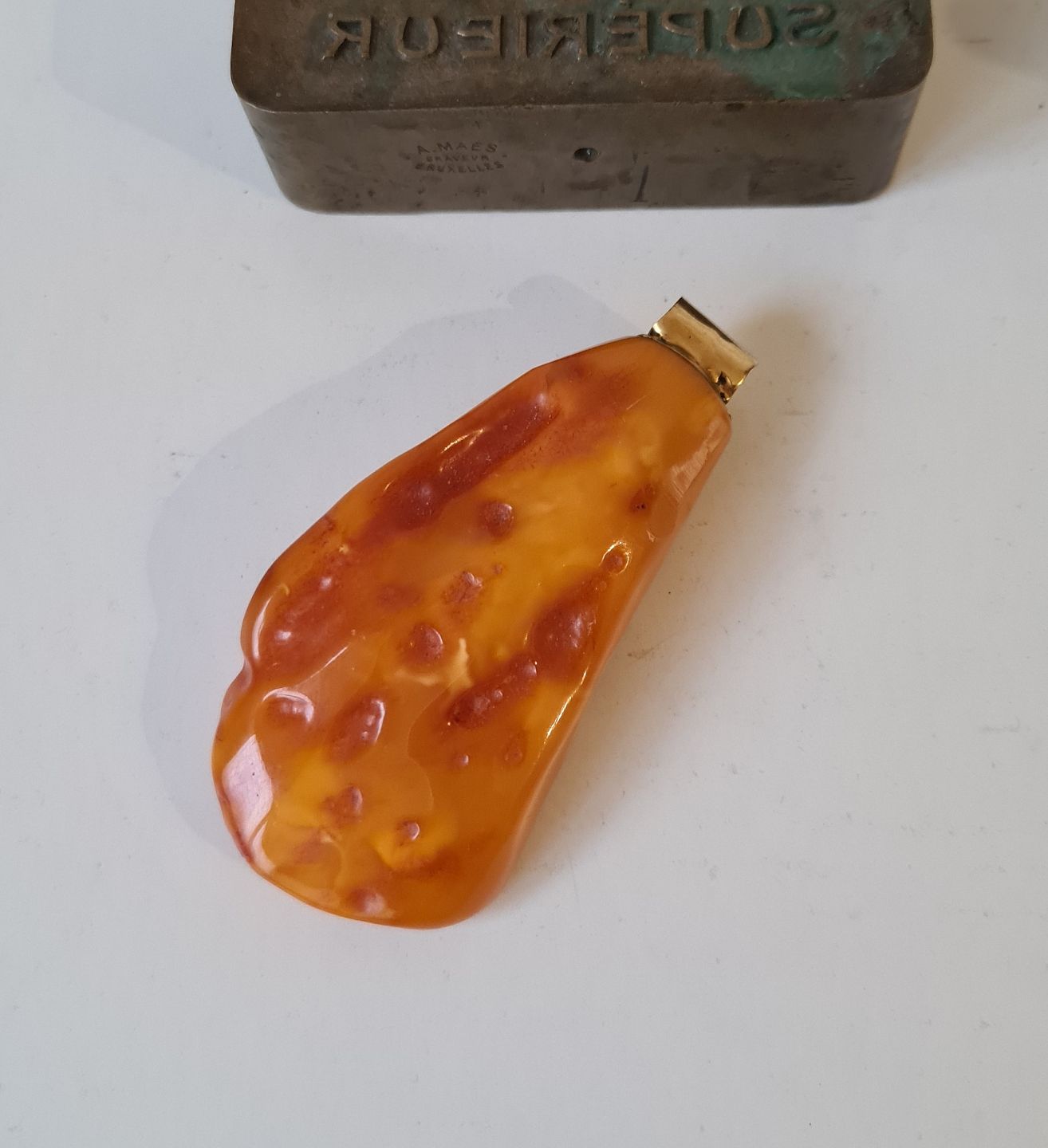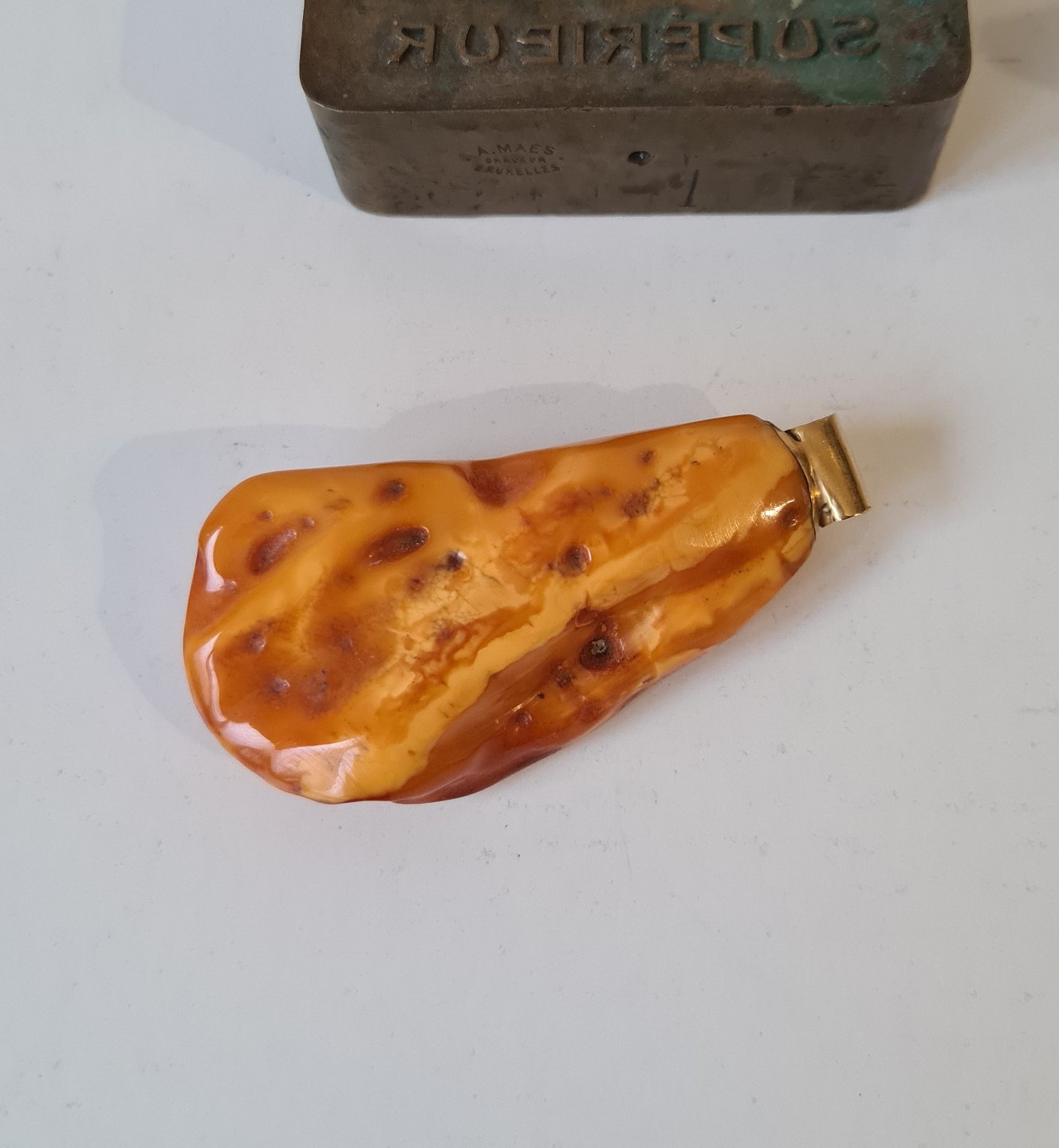 Stor poleret ravklump med øsken i 14 kt guld. 27,6 gram. |