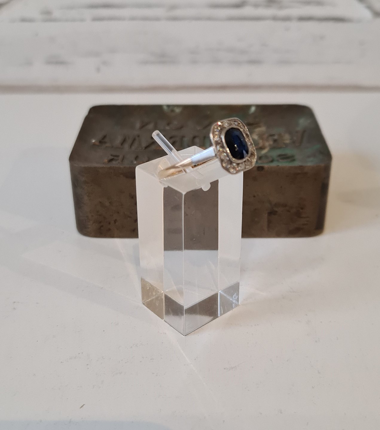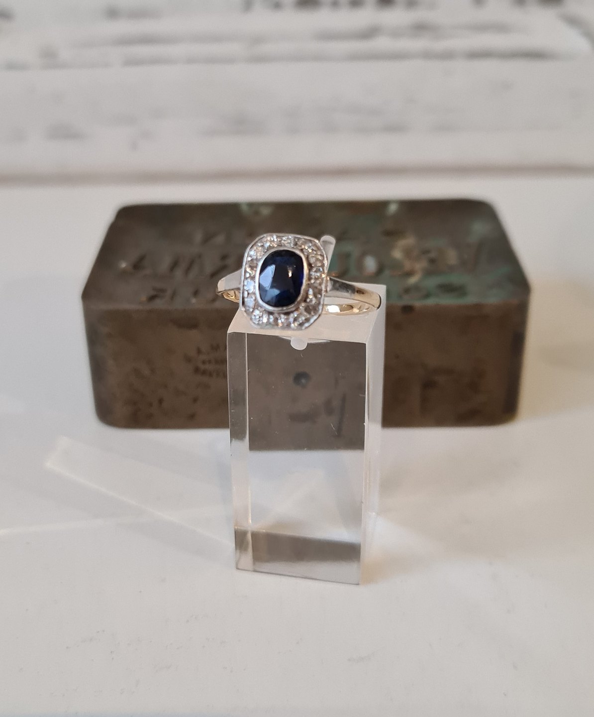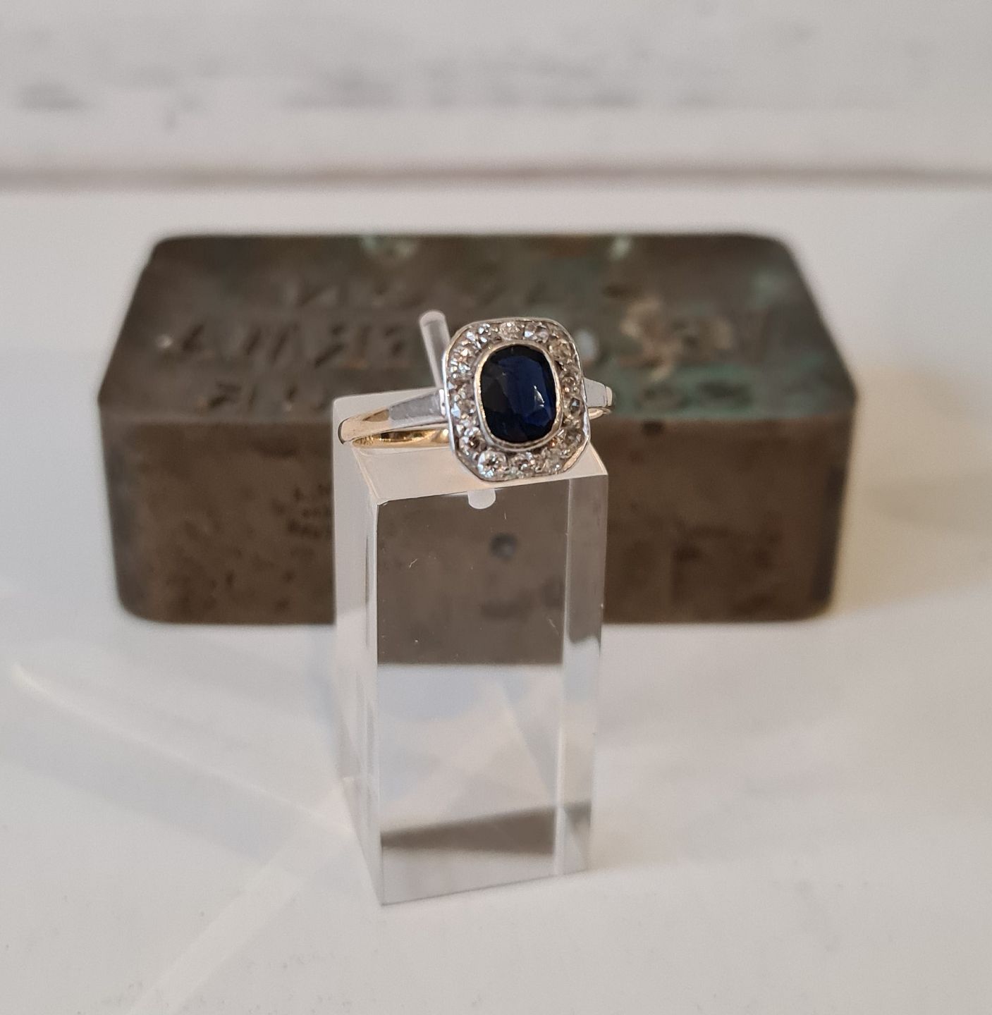 Smuk mørkeblå safir omkranset af 14 old mine cut diamanter.