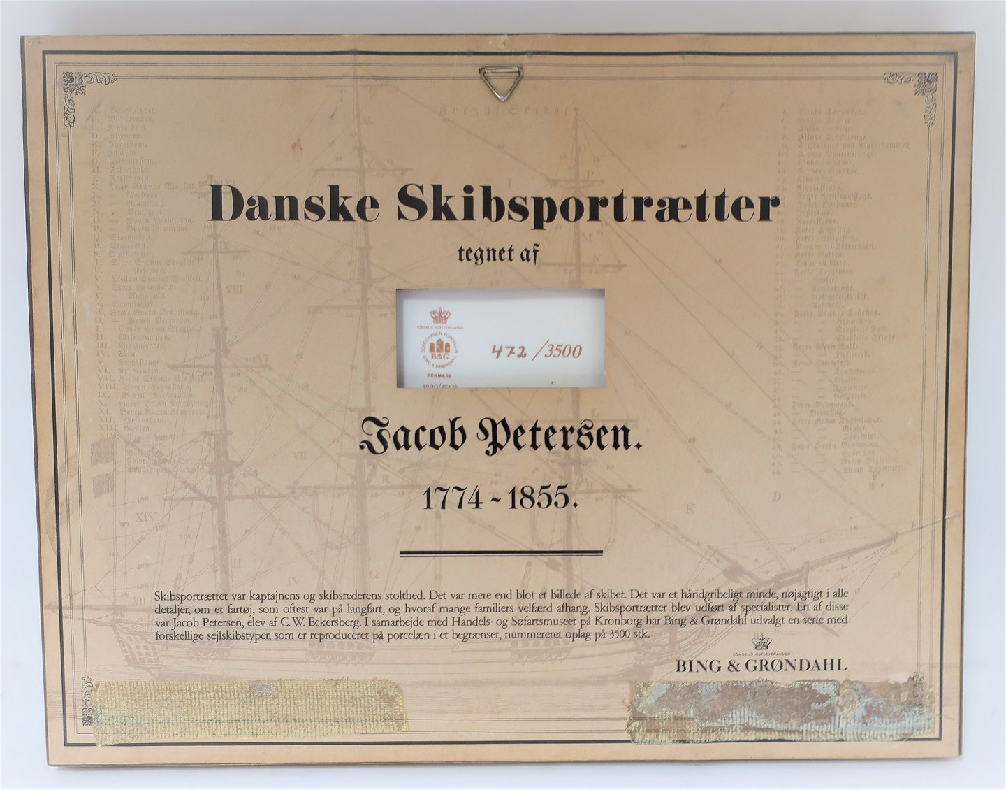 Bing & Grøndahl. Porcelæn. Danske skibsportrætter. Billed af "Skonnerten Prinsesse Caroline af Kjøbenhavn. Mål : Bredde 38* 30 cm. Der er produceret 3500, og denne er no. 472.