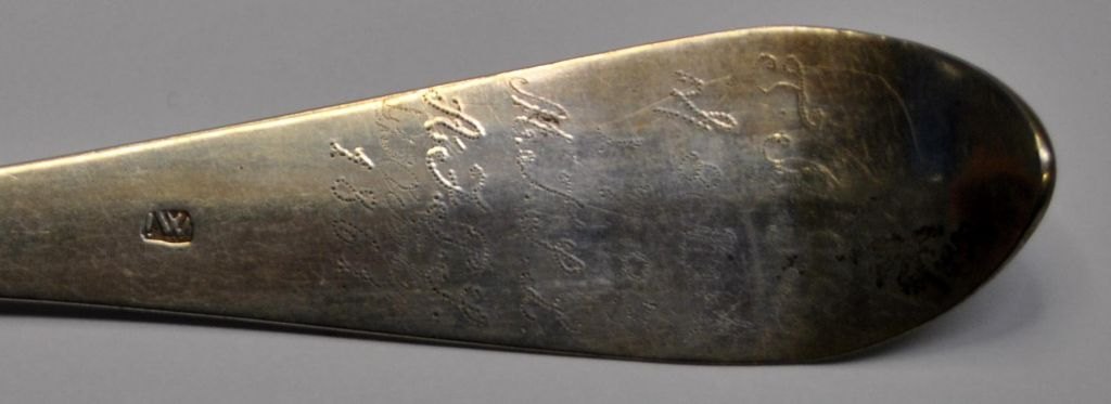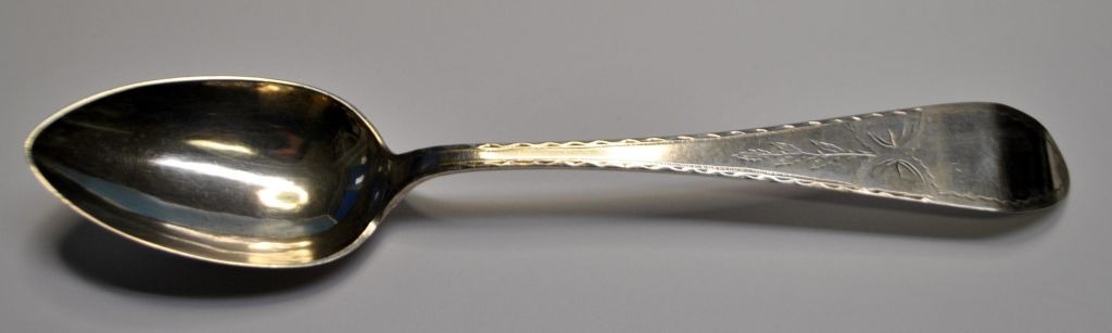 Sølv ske, empire, Jørgen Jonassen Winther (1769 - 1827), Horsens, Danmark. Stemplet. L: 22,5 cm. Med graveringer og inskriptioner fra 1783 og senere 1861.
