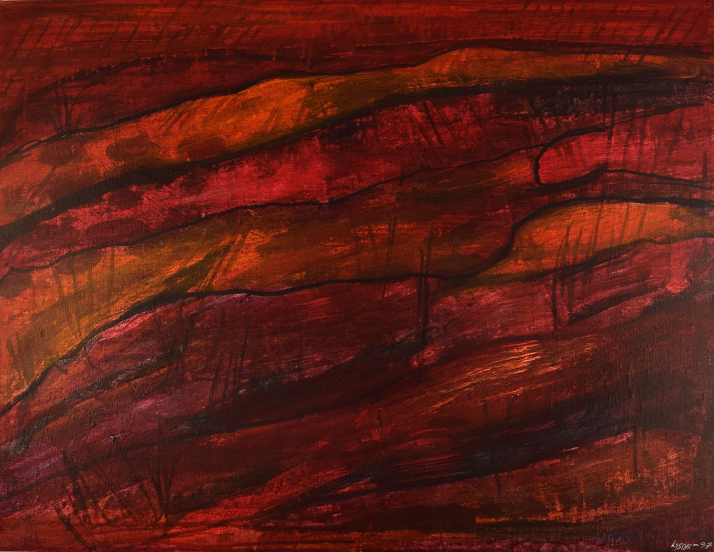 Ivy Lysdal, f 1937. Dansk keramiker og kunstmaler. Akryl på lærred. Abstrakt modernistisk maleri. Koloristisk palette. Dateret 1997.