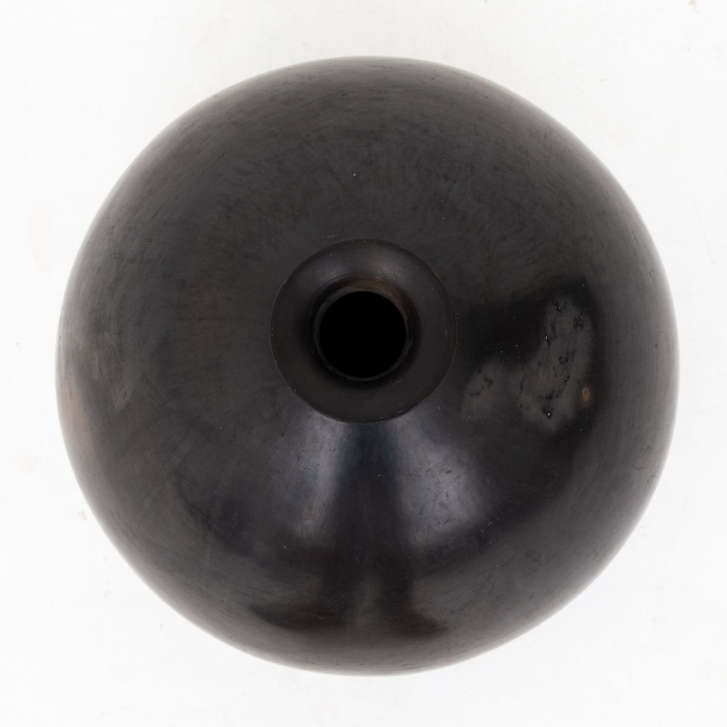 Stor rundbundet krukke i mørkbrændt lertøj på base i flettet bambus.