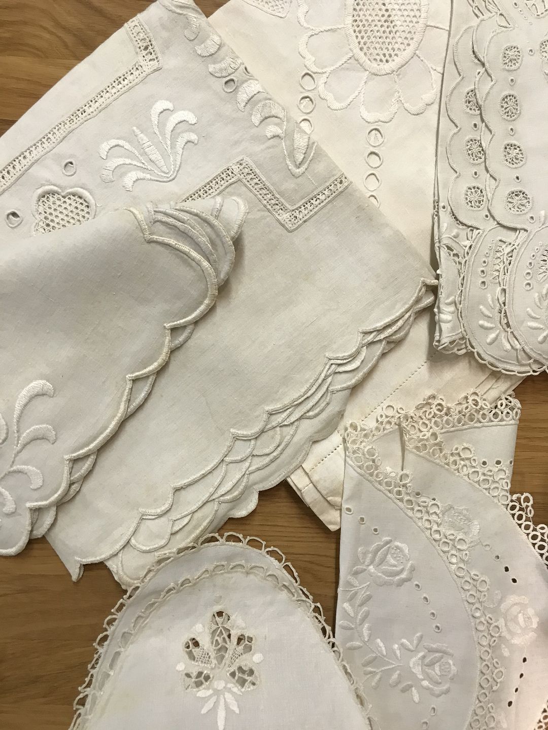 Hedebo og ander syninger på lysduge kaffeduge og middagsduge. Original stand der er god.
