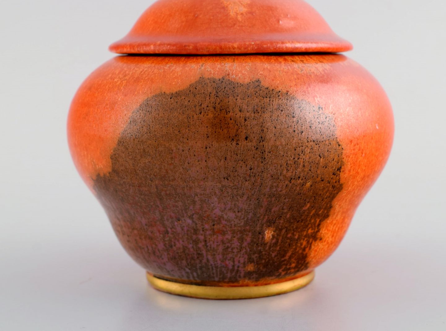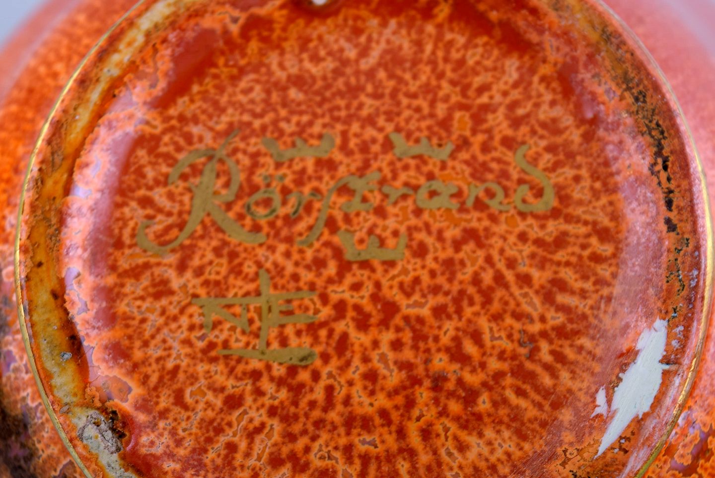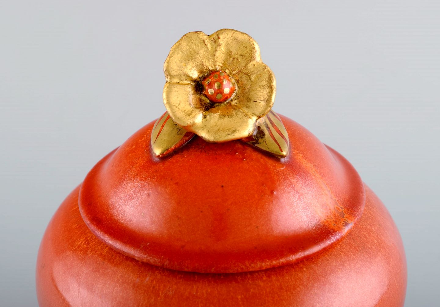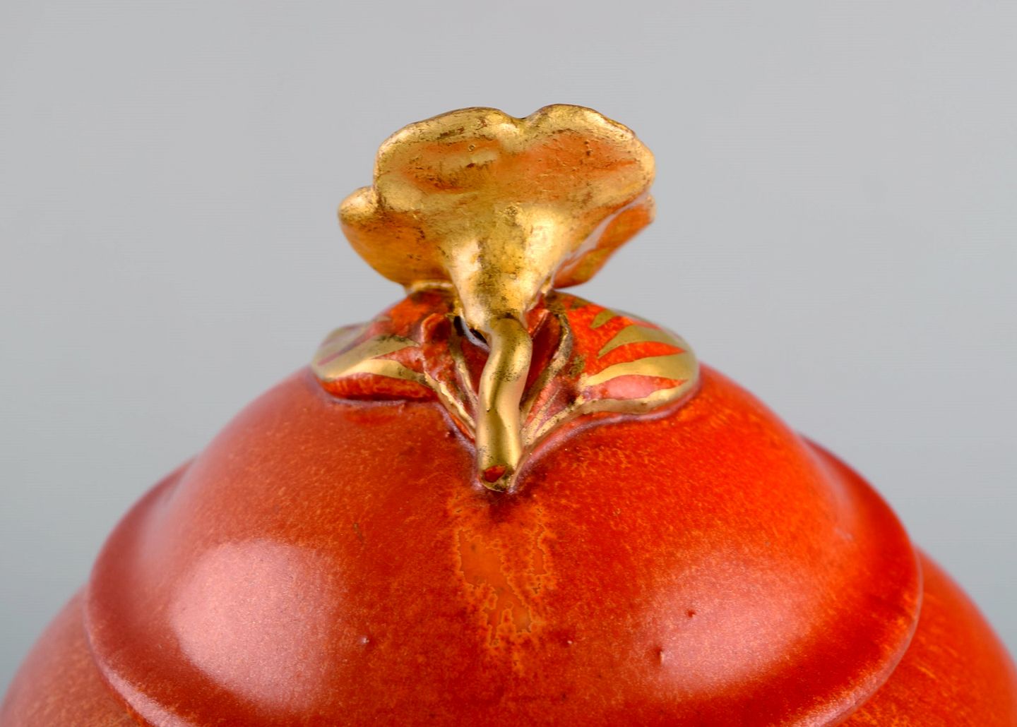 Nils Emil Lundström (1865-1960) for Rörstrand. Antik lågkrukke i glaseret keramik. Smuk orange glasur og blomst i guld på laget. Start 1900-tallet.
