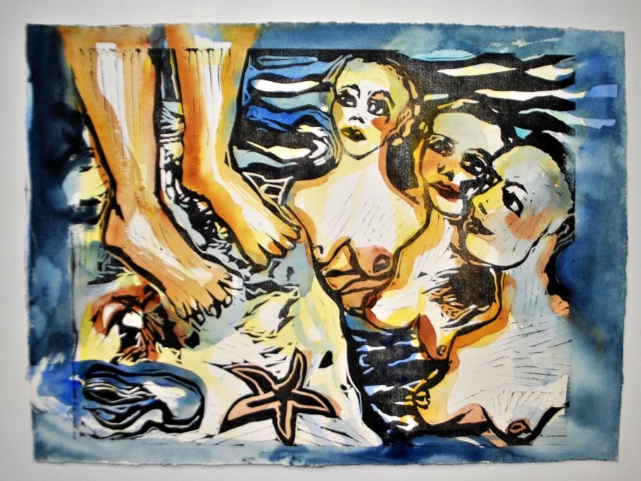 Degett, Karen (1954 - 2011) Danmark: Komposition. Håndkoloreret træsnit. Unika. Usigneret. 53 x 39 cm. Uindrammet.  Proveniens: Kunstnerens bo. Pt. 2 tryk på lager. Unika.