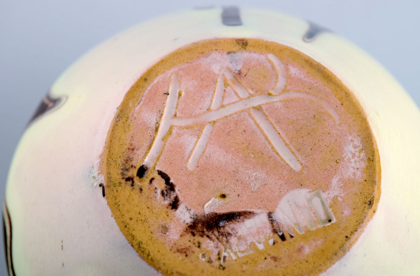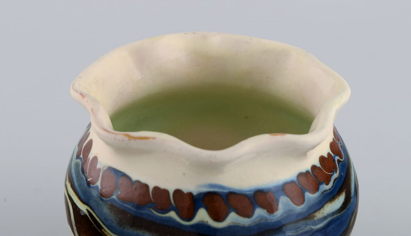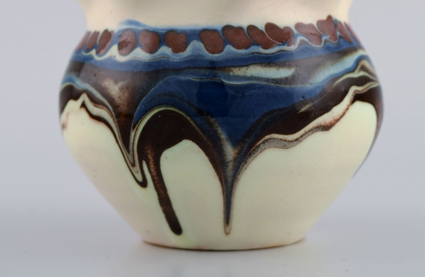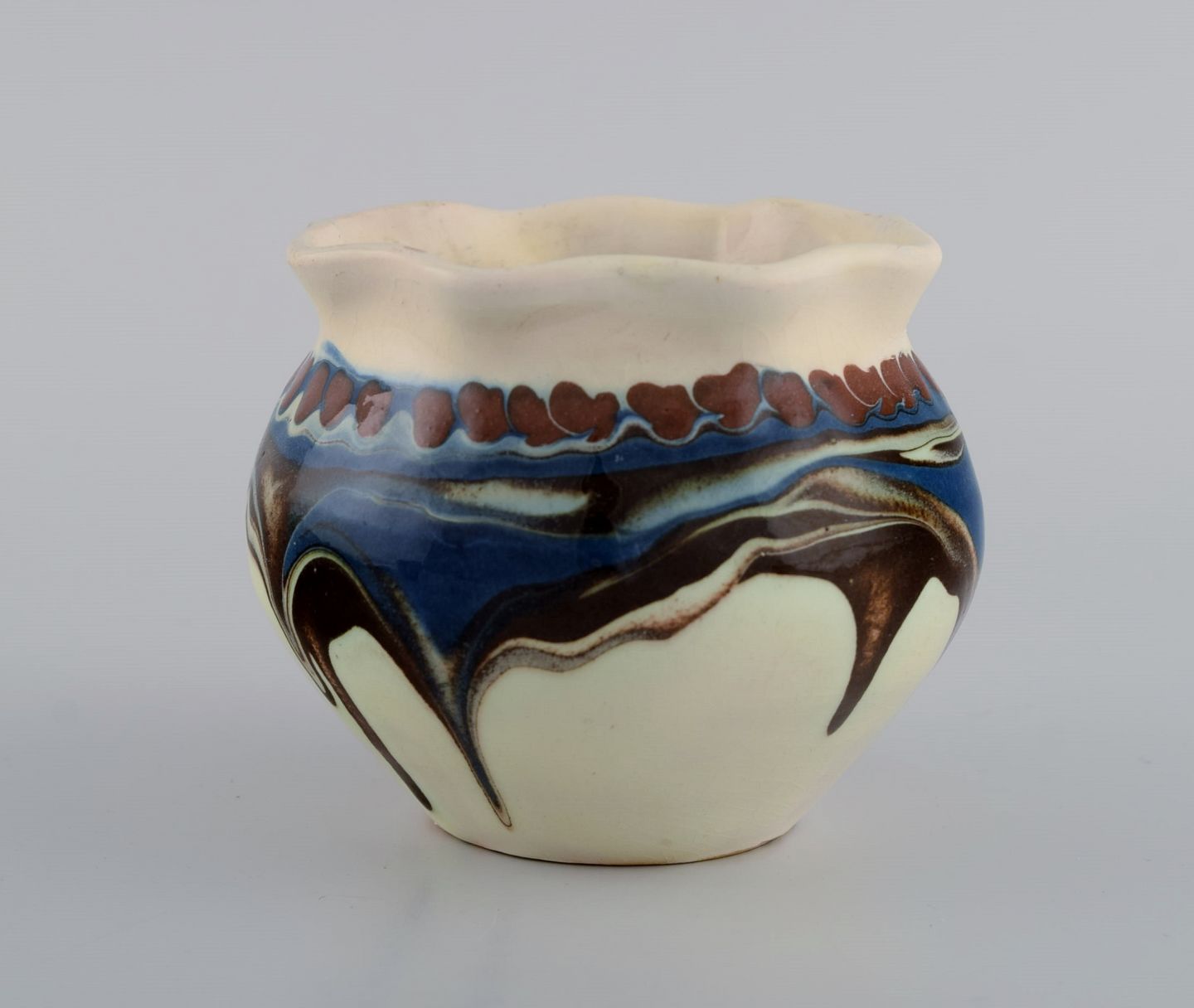 Kähler, HAK. Glaseret stentøjsvase i moderne design. Blå og brun løbeglasur på cremefarvet baggrund. 1930/40´erne.