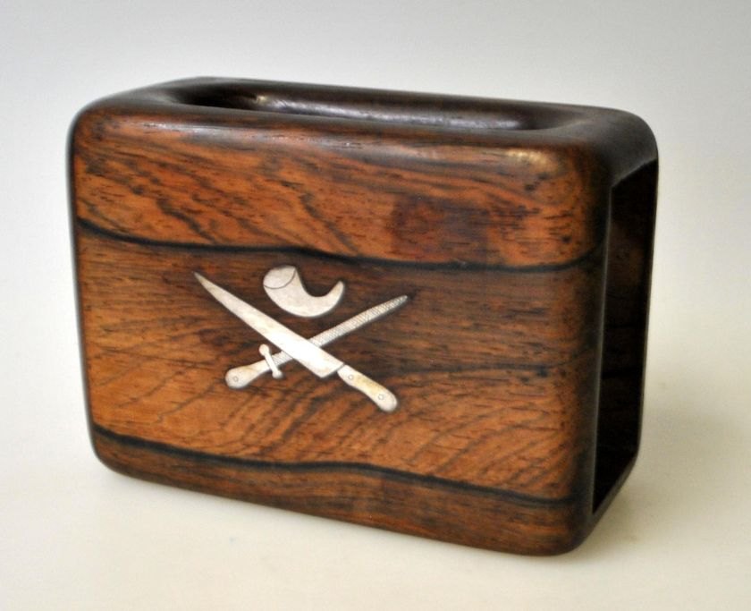 Frantz Hingelberg tændstik æske holder, 1940 - 1950, Aarhus, Danmark. Palisander med indlagt sølv attributter for en slagter. Stemplet. 11 x 7,6 x 5,3 cm.