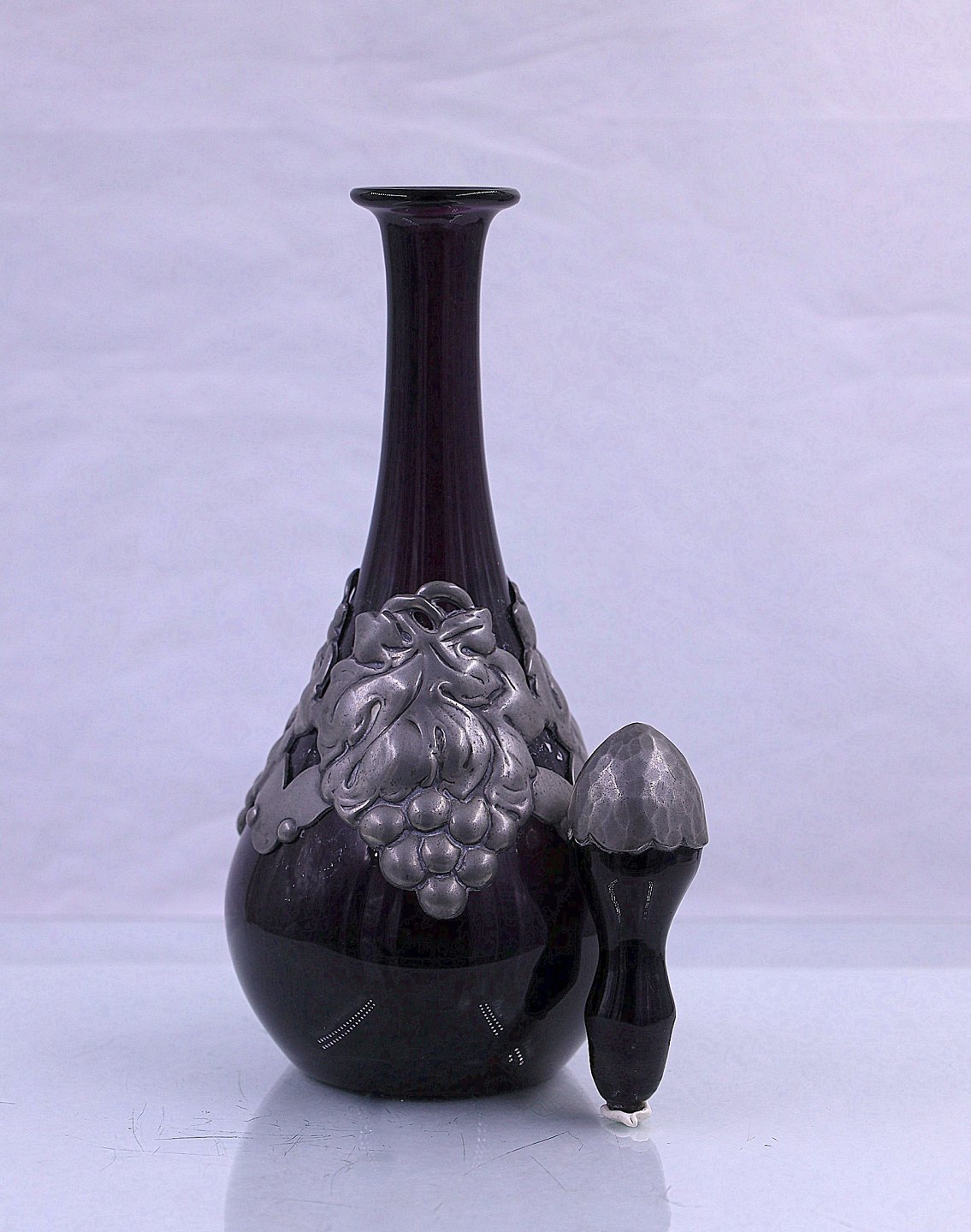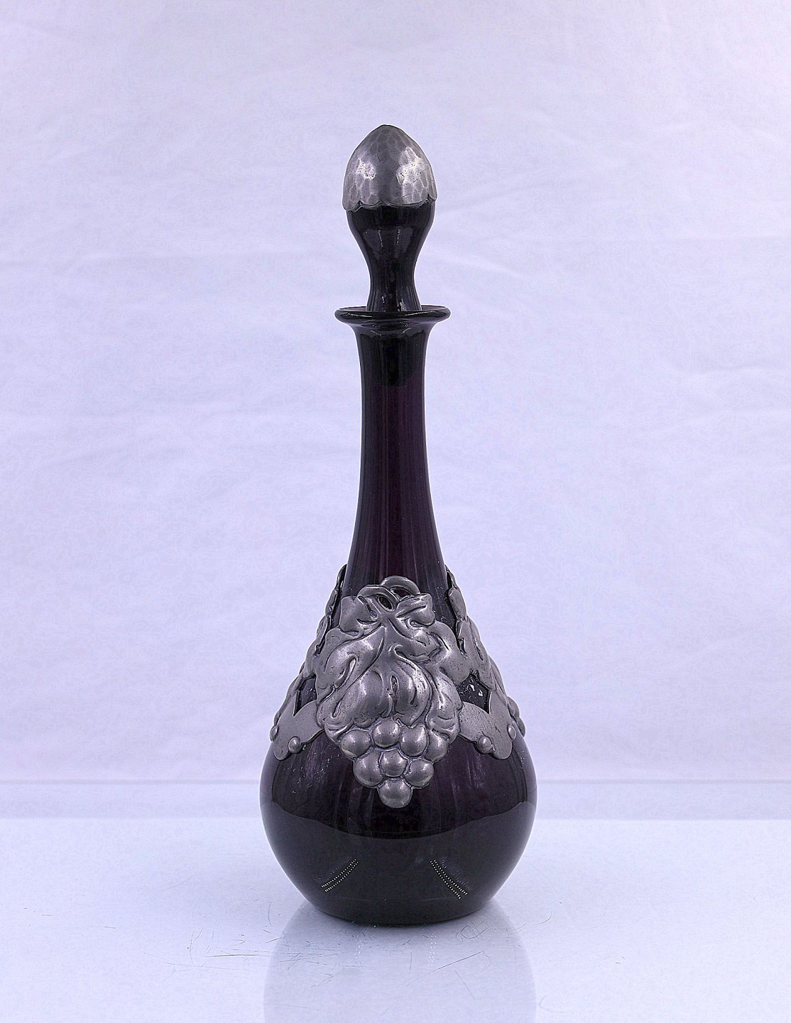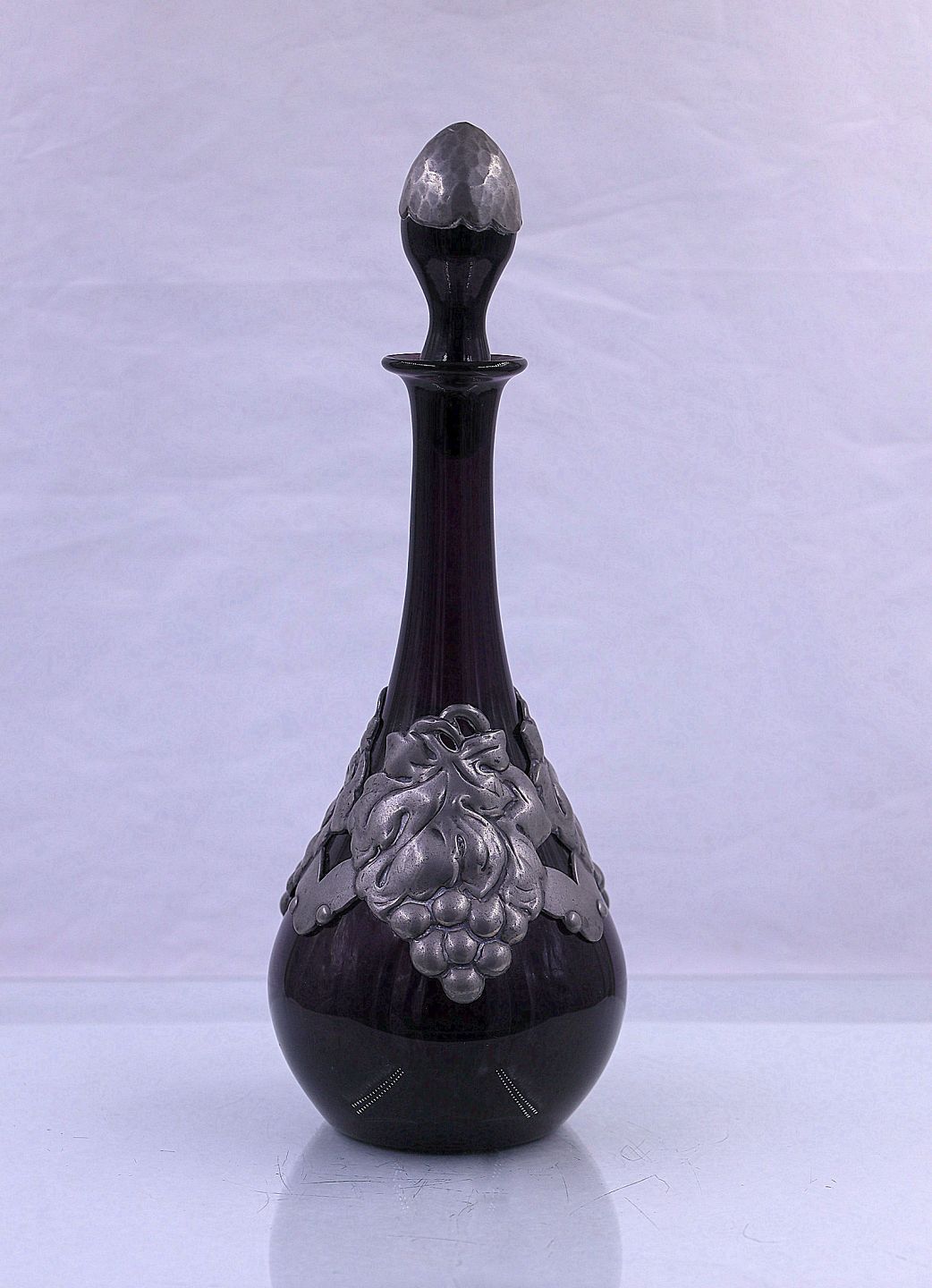 Glaskaraffel med tin krave og tin på proppen. Flasken har farven mørk bordeaux. Der er ingen brugsspor på karaflen