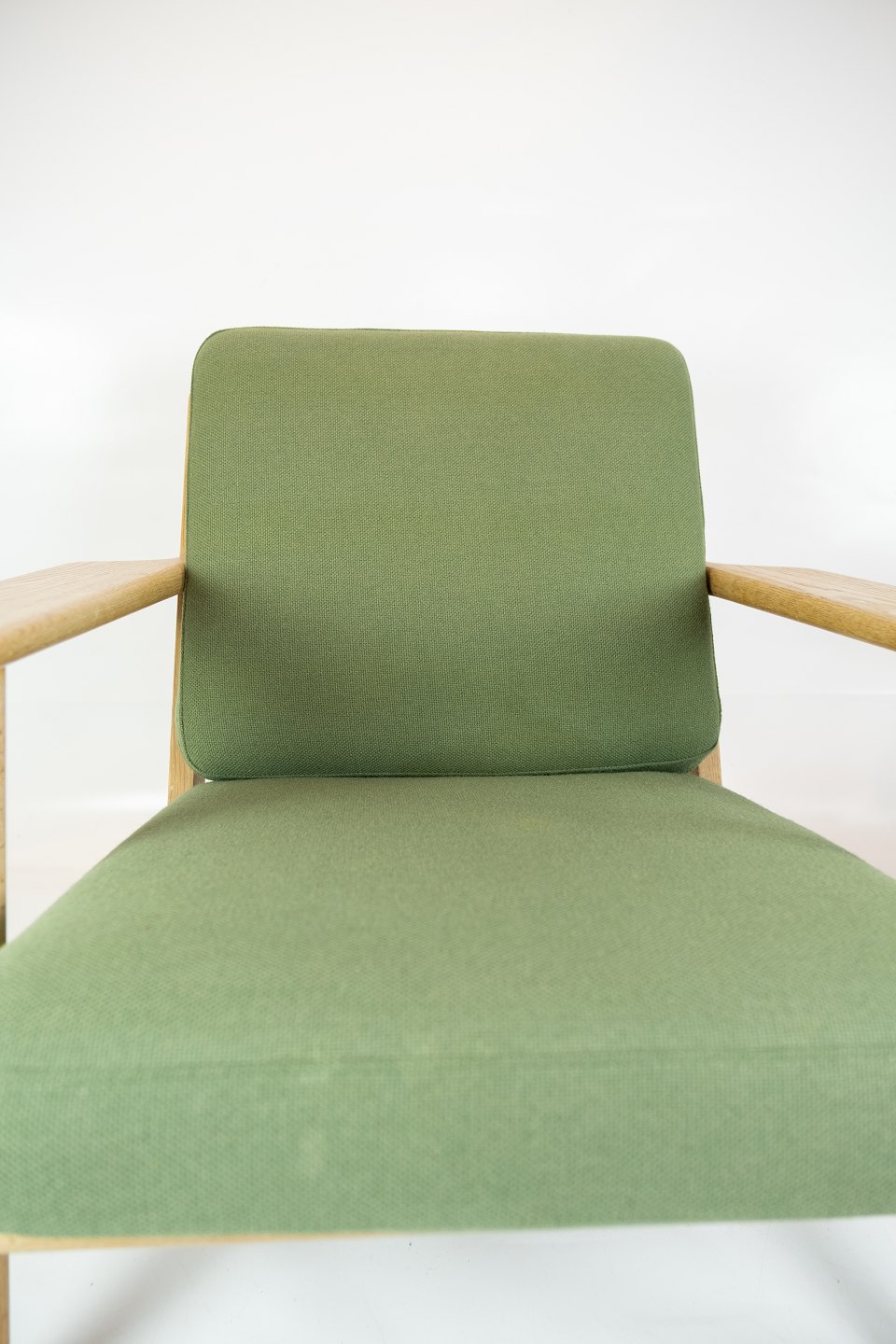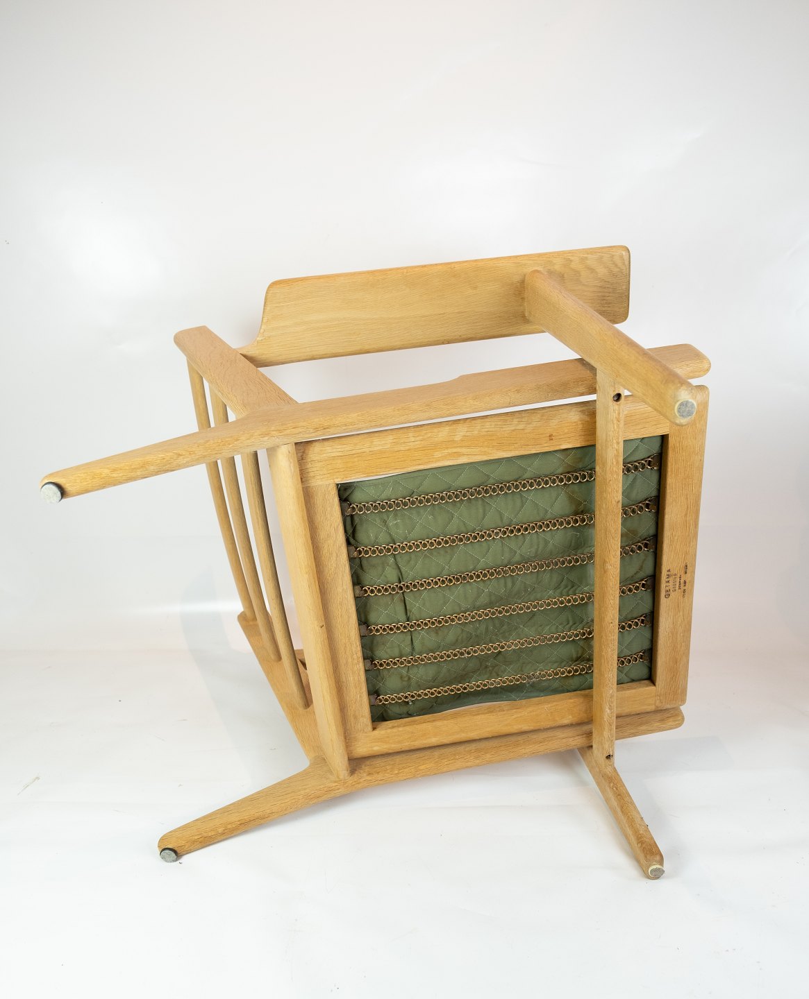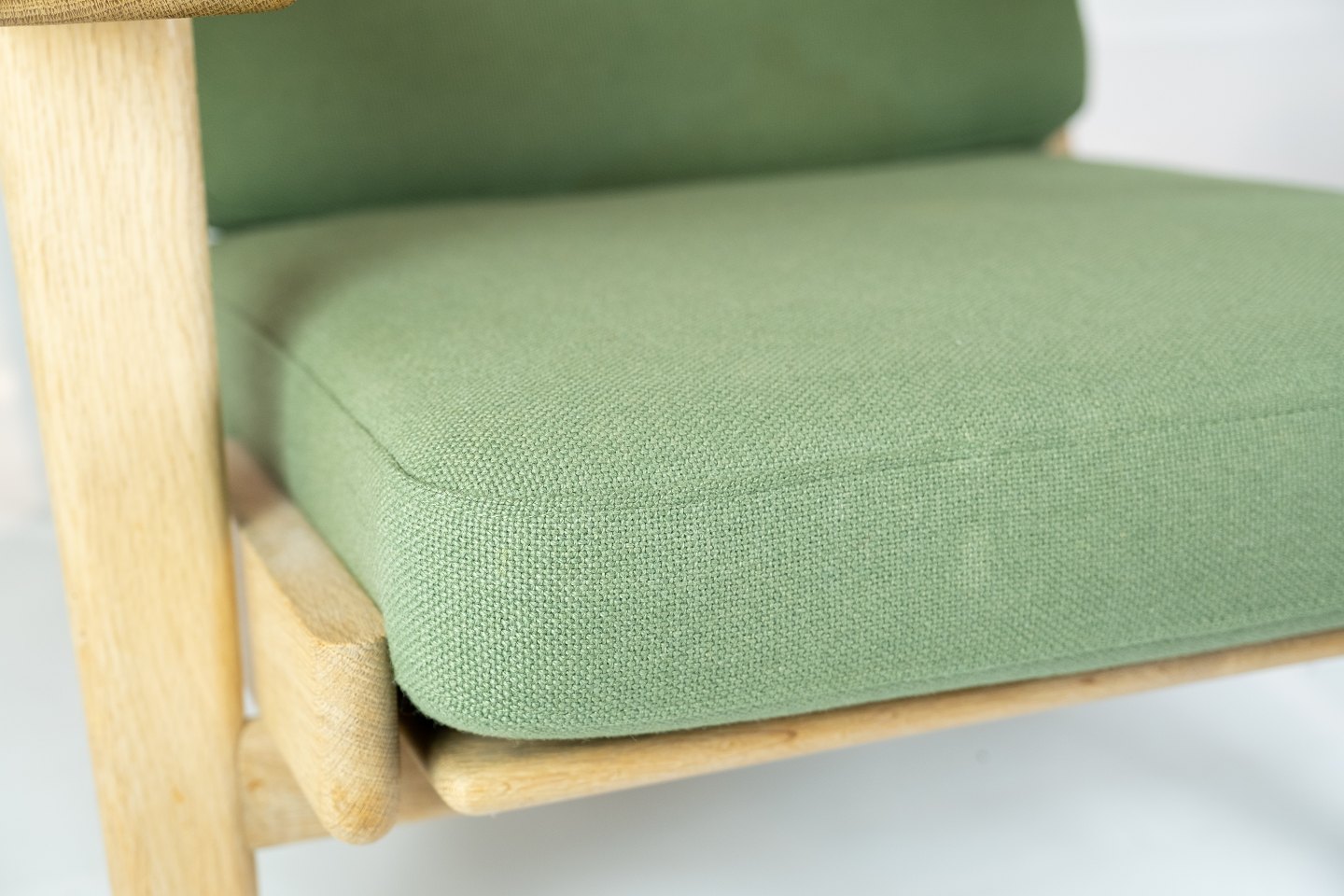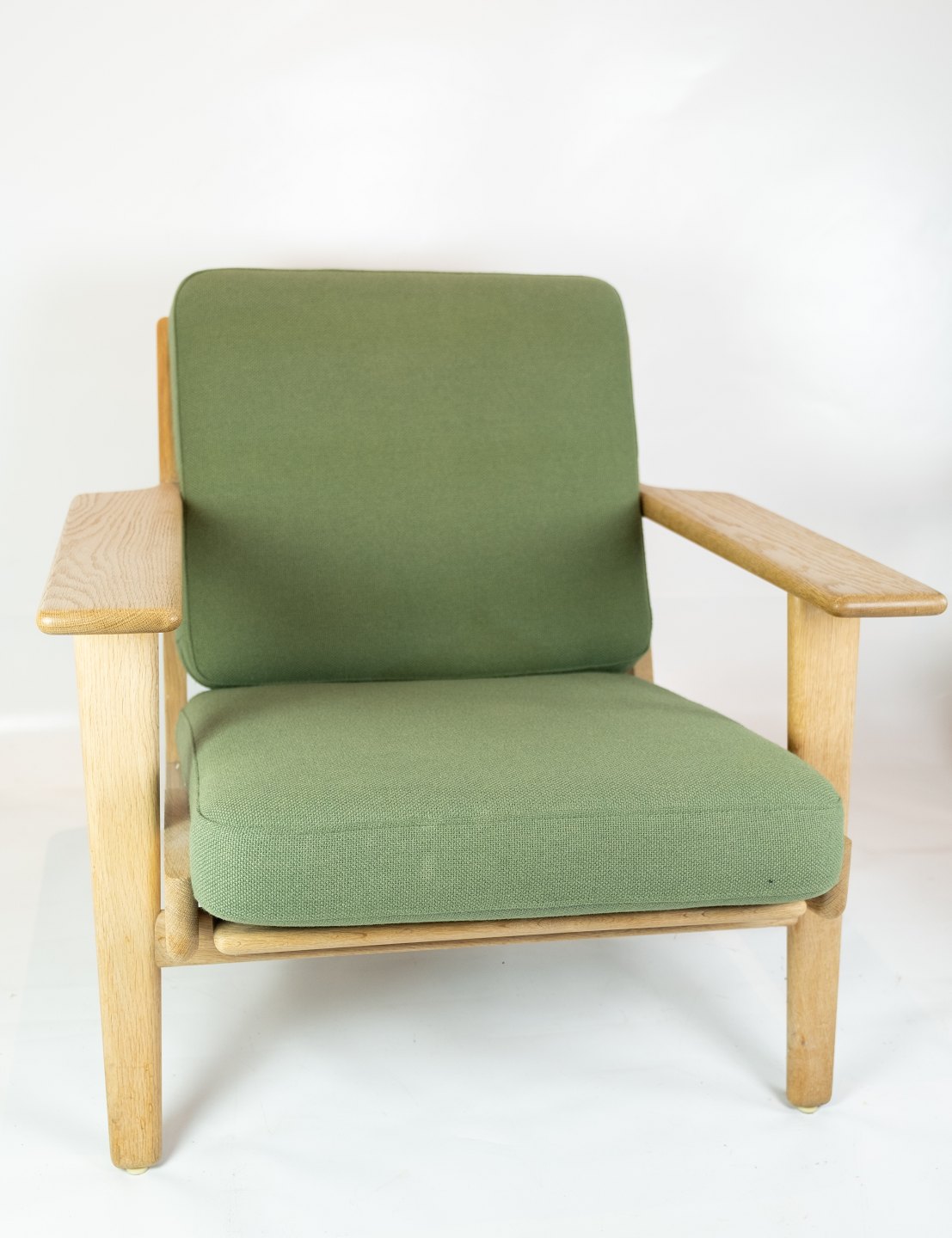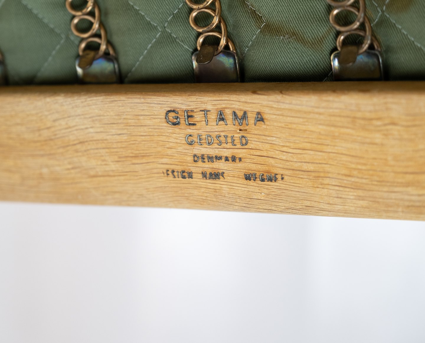 Denne lænestol, model GE290, er designet af Hans J. Wegner i 1950'erne og fremstillet hos GETAMA i 1960'erne. Stolene er lavet af solid eg, hvilket giver dem både styrke og en naturlig skønhed.