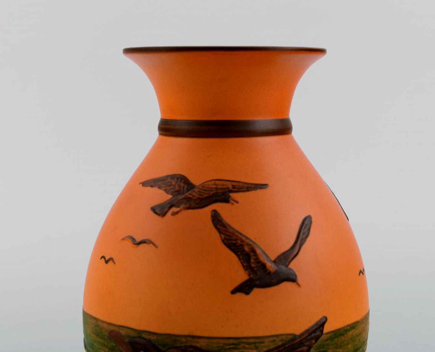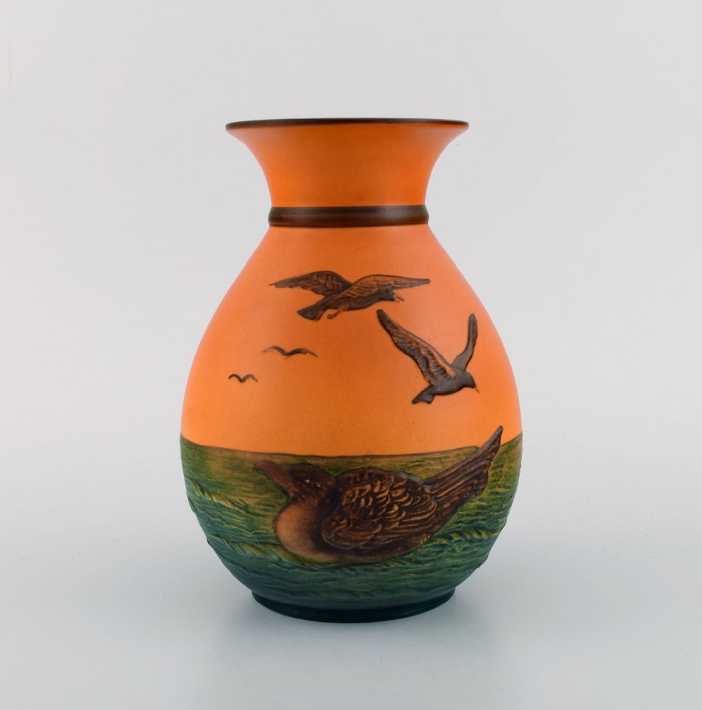 Ipsens enke, Danmark. Vase med havmåger i håndmalet glaseret keramik. Modelnummer 476. 1930'erne.
