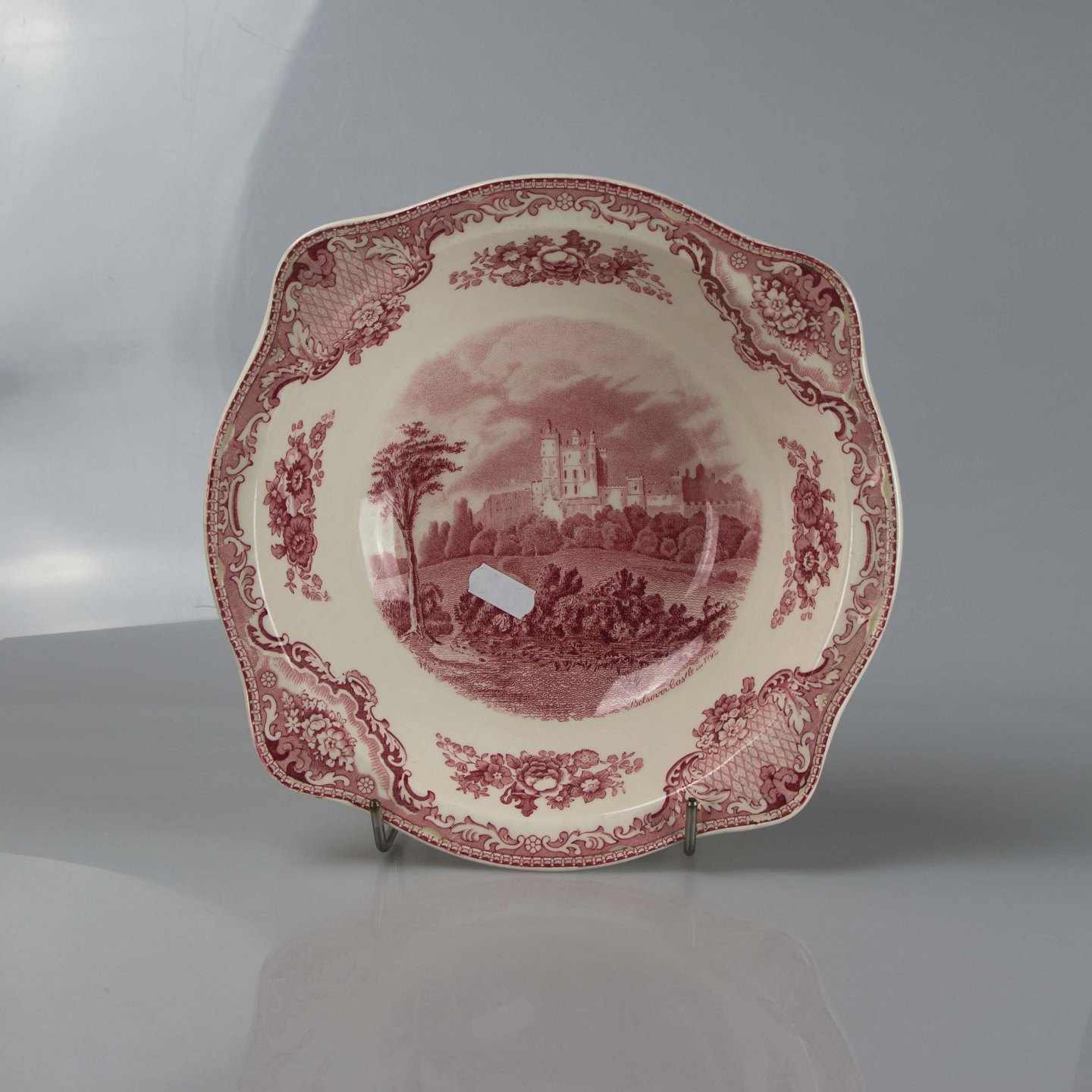 Skål i lys fajance med røddekoreret slotsmotiv.