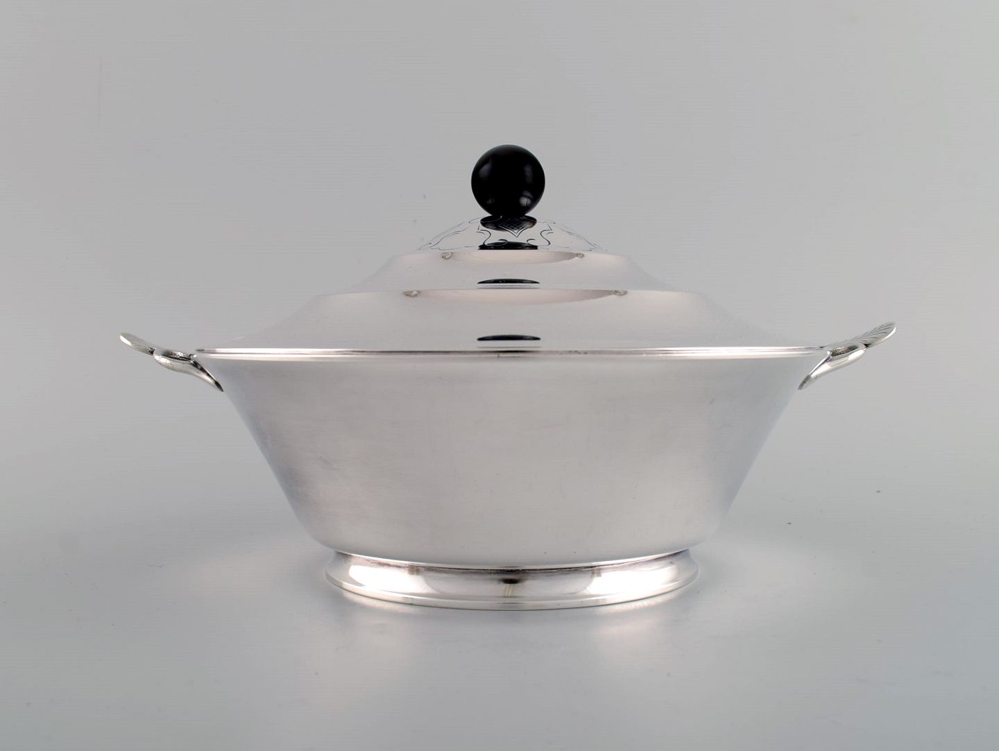 Just Andersen for GAB. Sjælden art deco lågskål i nysølv med bladformede hanke. 1920'erne.