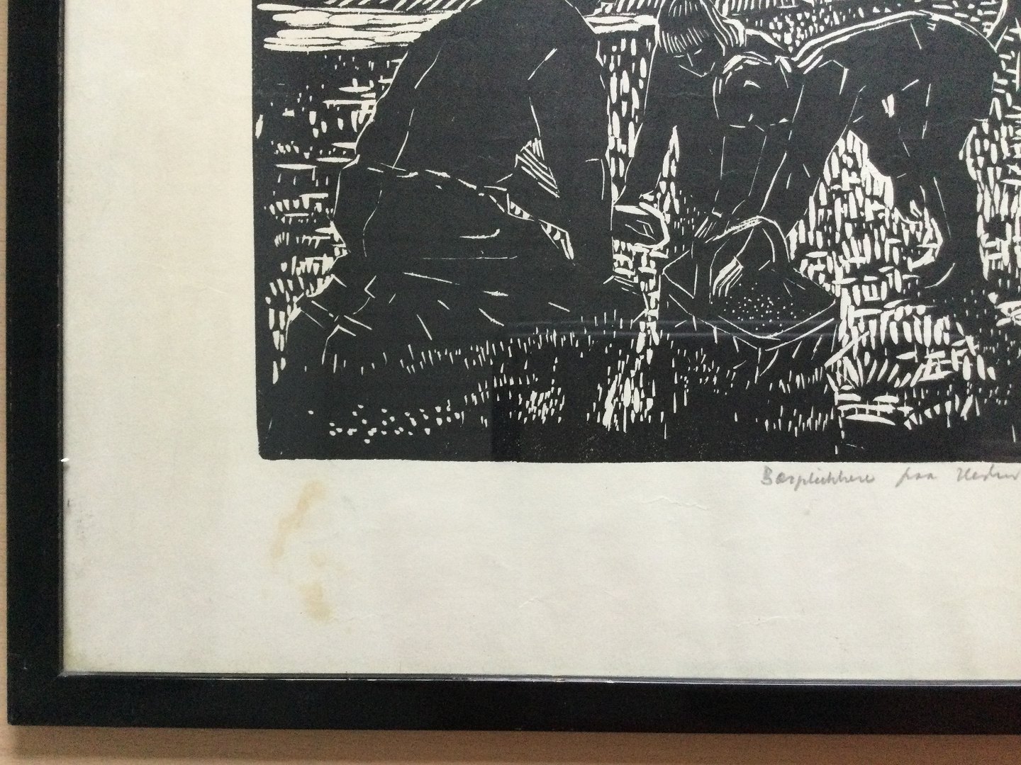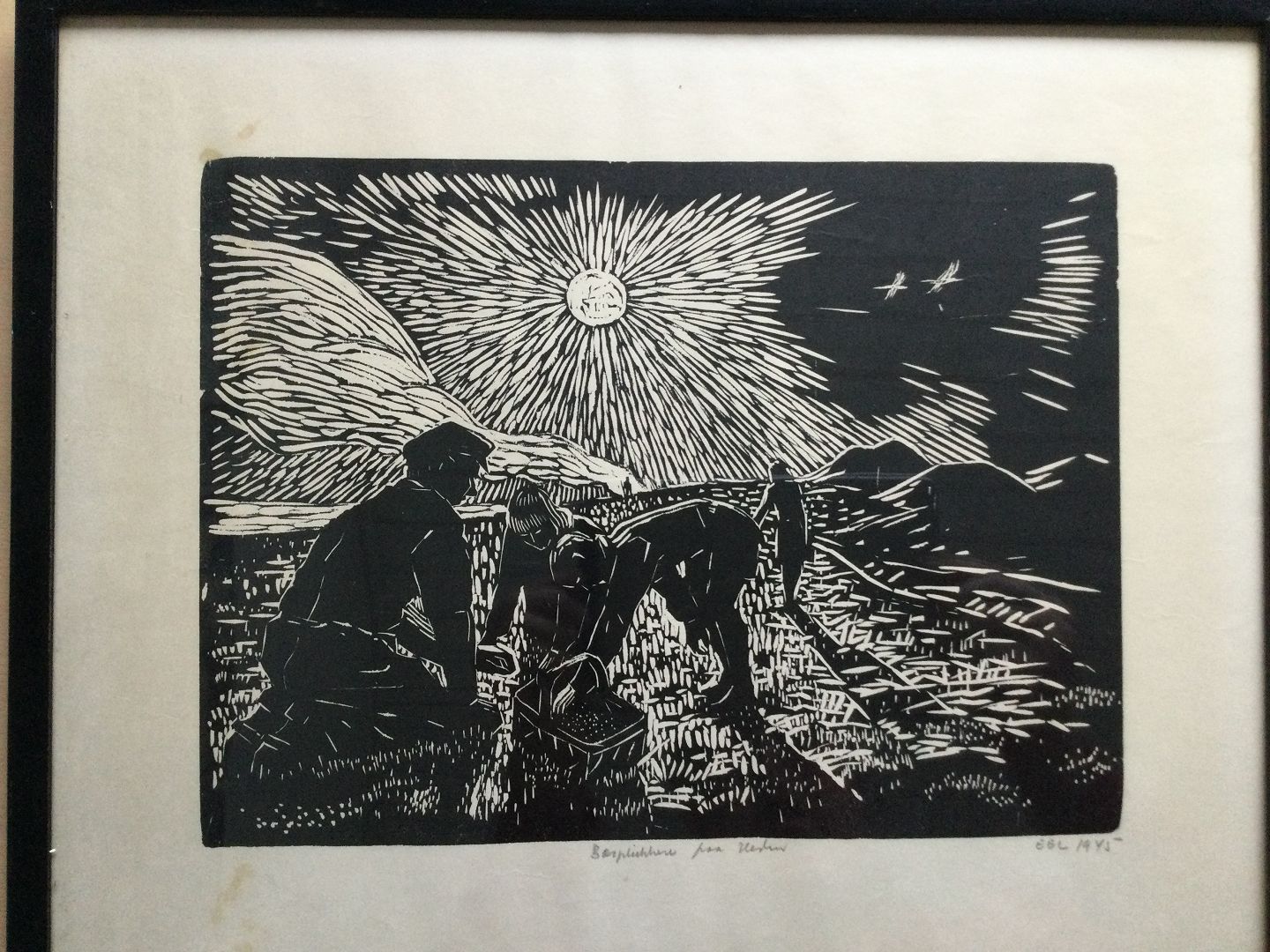 Linoleumssnit af Knud Eel - Bærplukkere på Heden 1945.