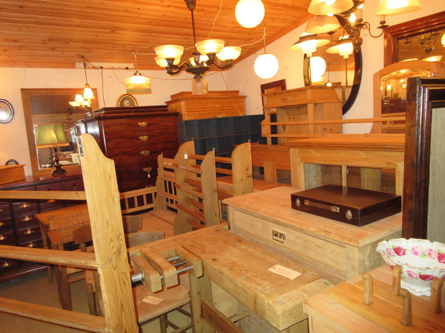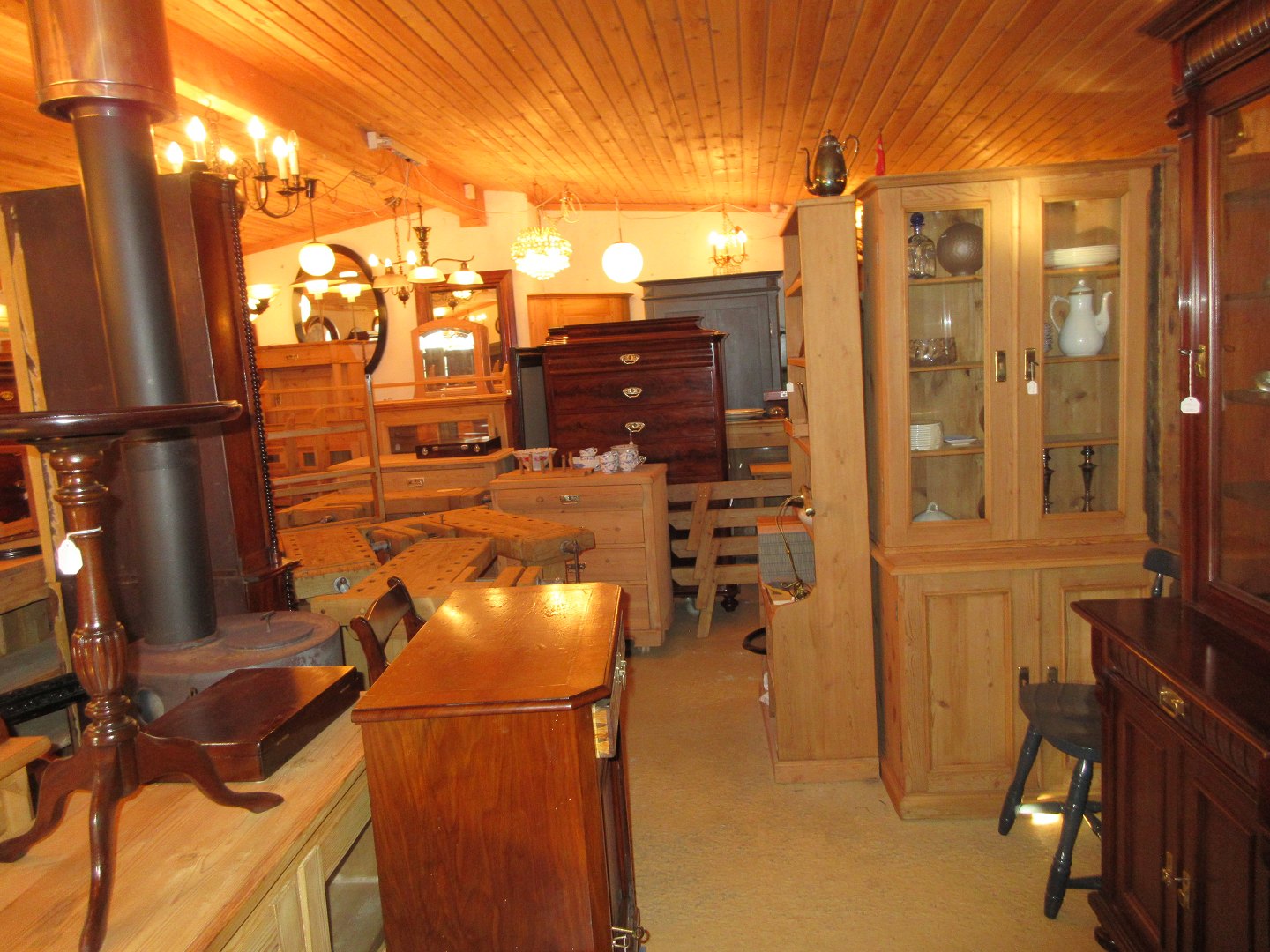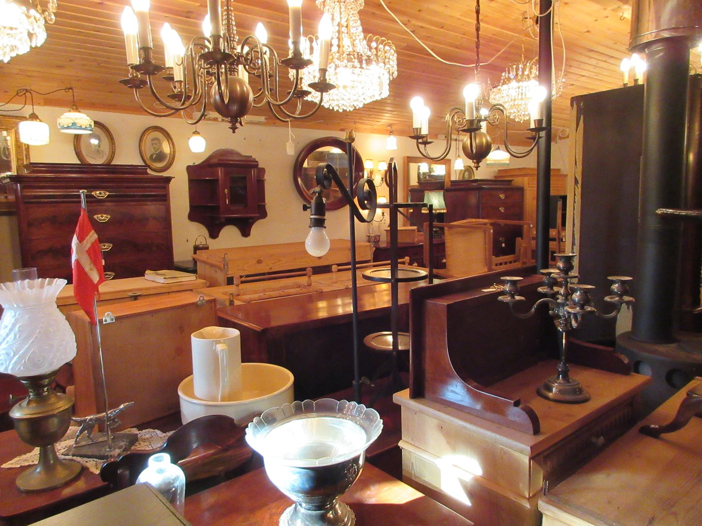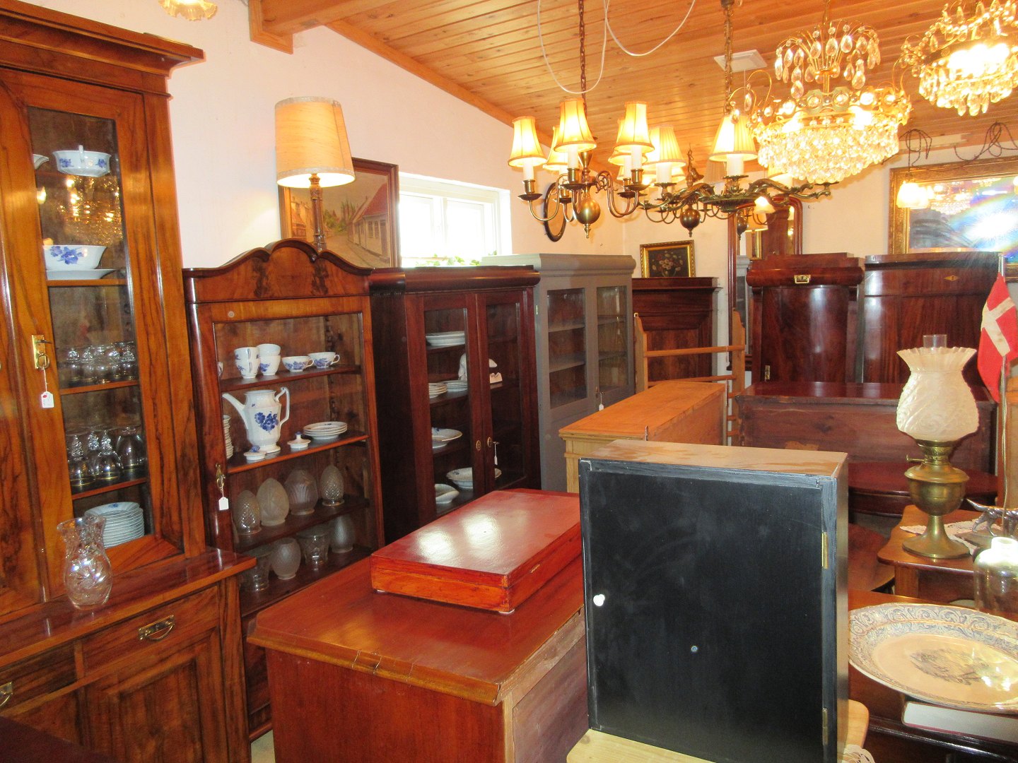 Stor salgsudstilling med restaurerede møbler håndpolerede mahognimøbler, afsyrede fyrretræsmøbler, malede træmøbler, kun originale gamle og antikke møbler.