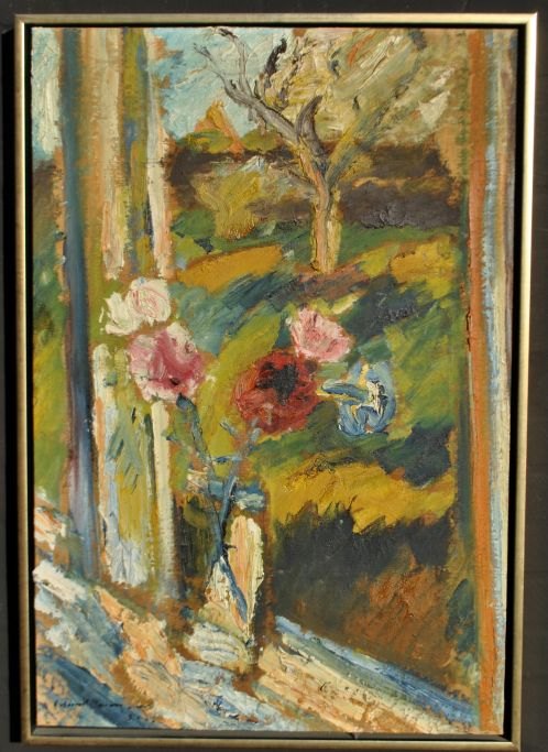 Borregaard, Eduard (1902 - 1978) Denmark: A bouquet in a window. Oil on canvas. Signed 1936. 85 x 58 cm.