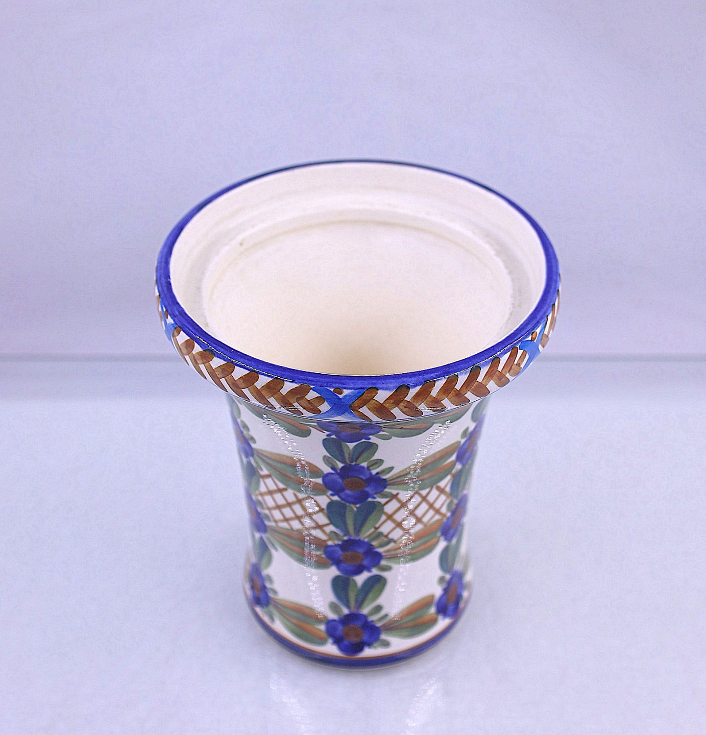 Aluminia, vase nr. 523/399. kunstfajance vase dekoreret med blå blomster og grønne/brune blade, på cremefarvet baggrund. Glasuren er polykrom