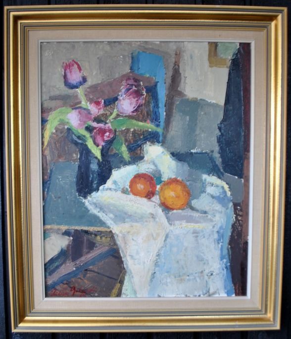 Gelardi, Ruben (1938 - ) Danmark: Opstilling på et bord. Olie på masonit. Signeret 1967. 56 x 48 cm.