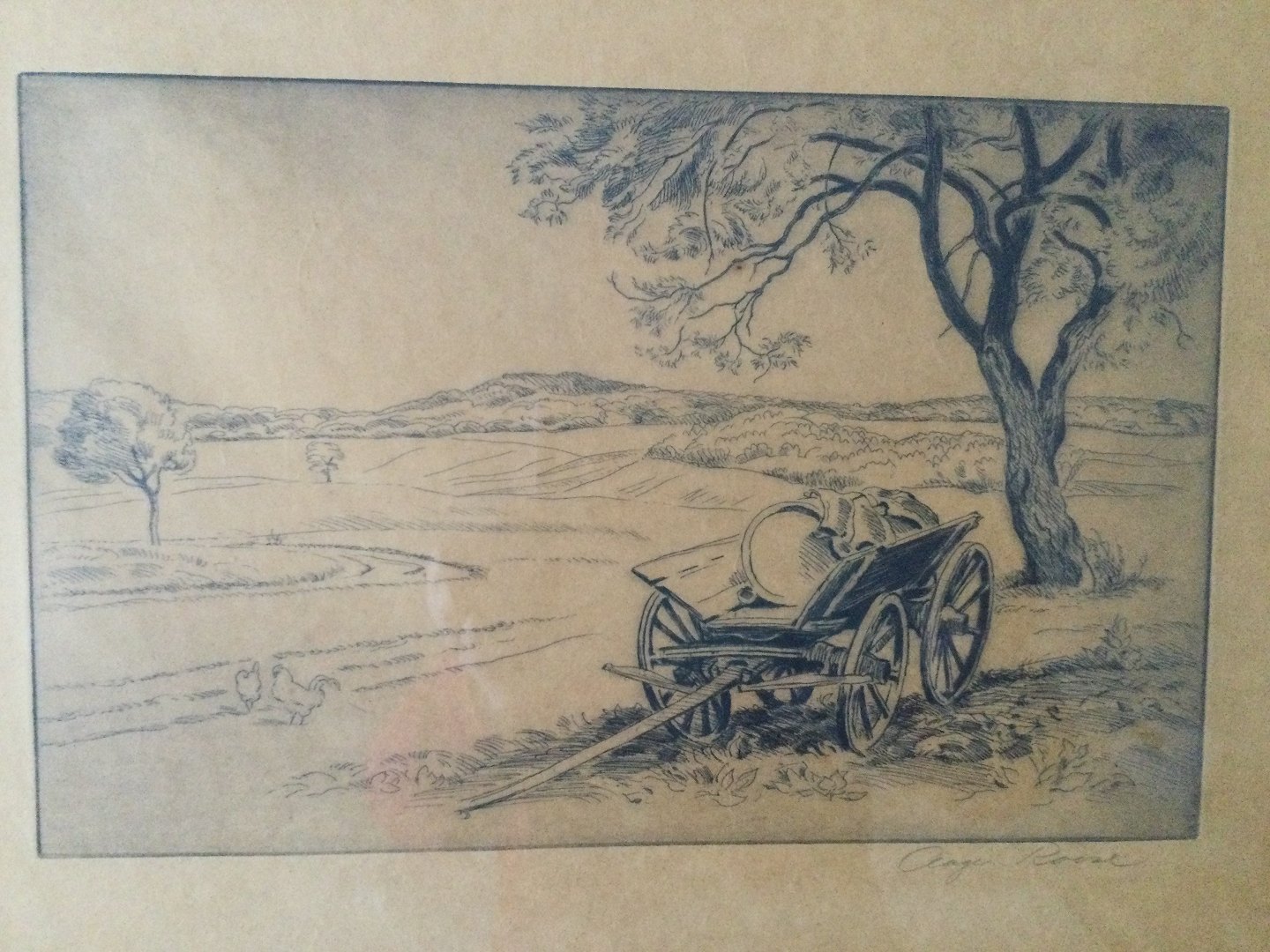 Gammel landbrugsvogn ved træ.