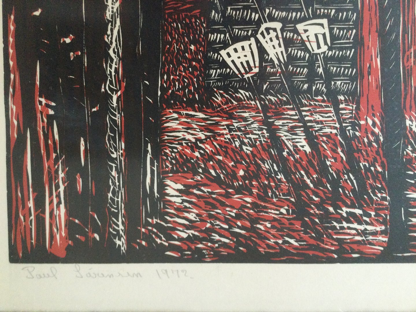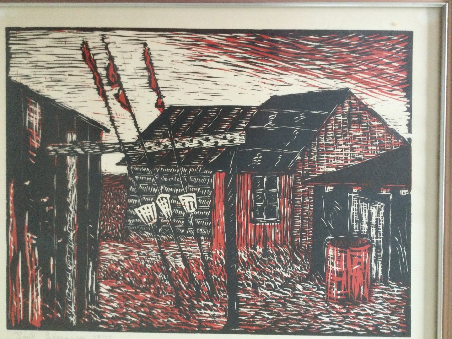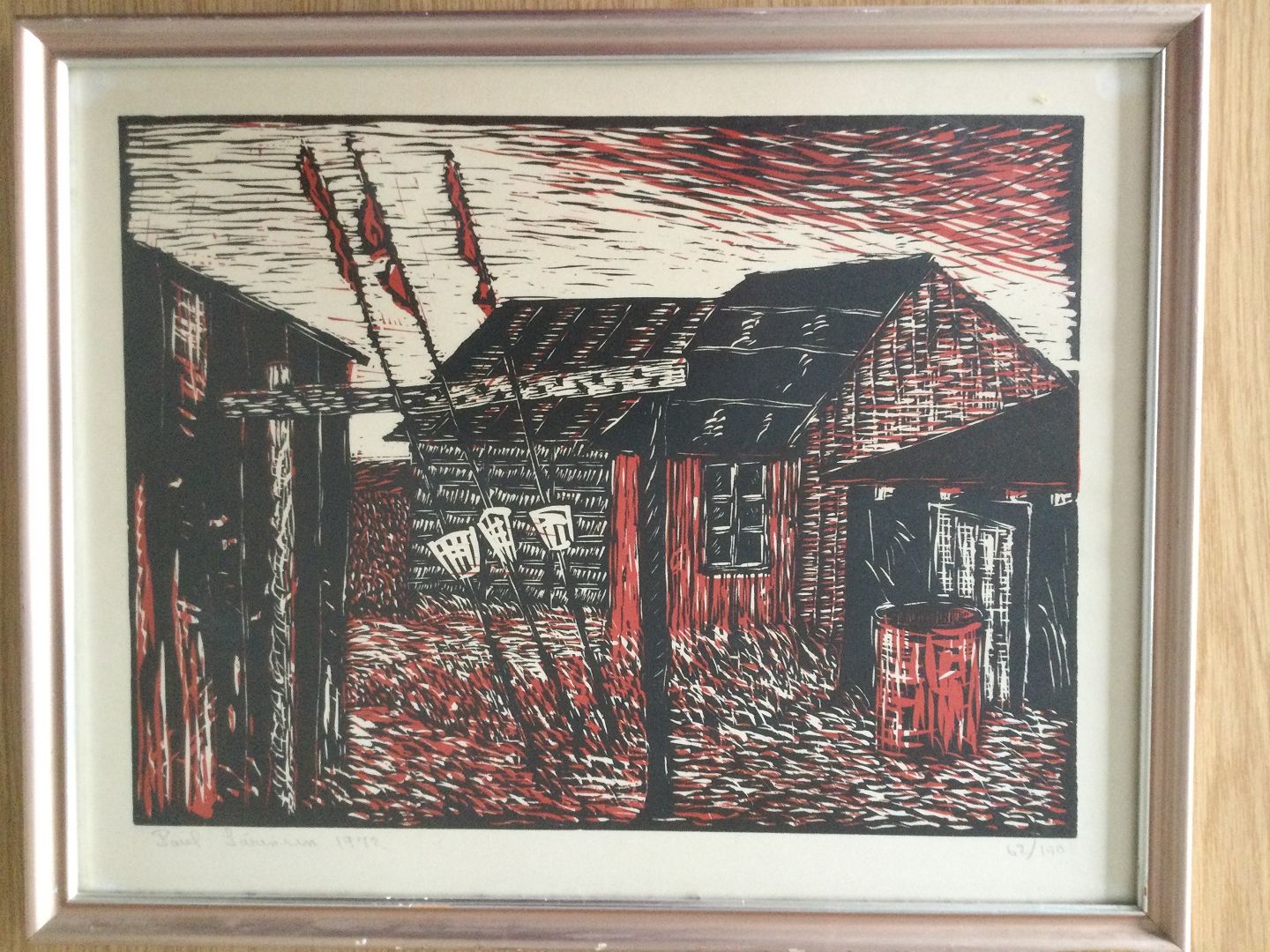 Træsnit af Poul Sørensen - Fiskerhuse 1972.