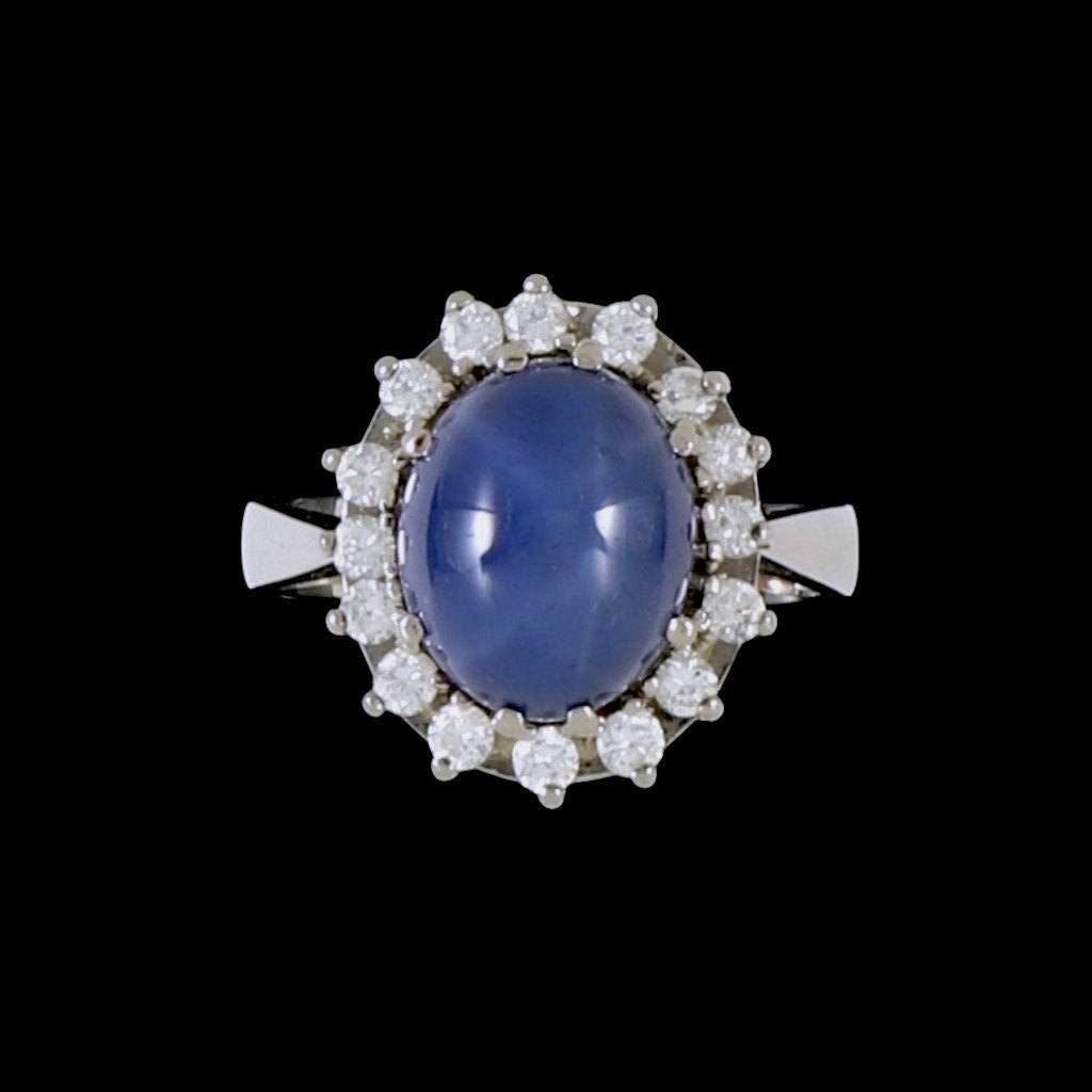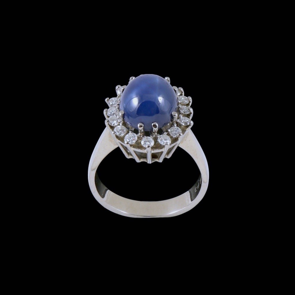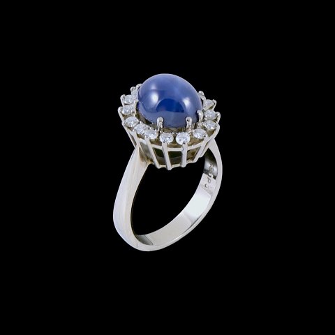Peter Jensen KBH. Cocktailring i 14k hvidguld med stjernesafir og 16 diamanter. Total 0,40 ct.