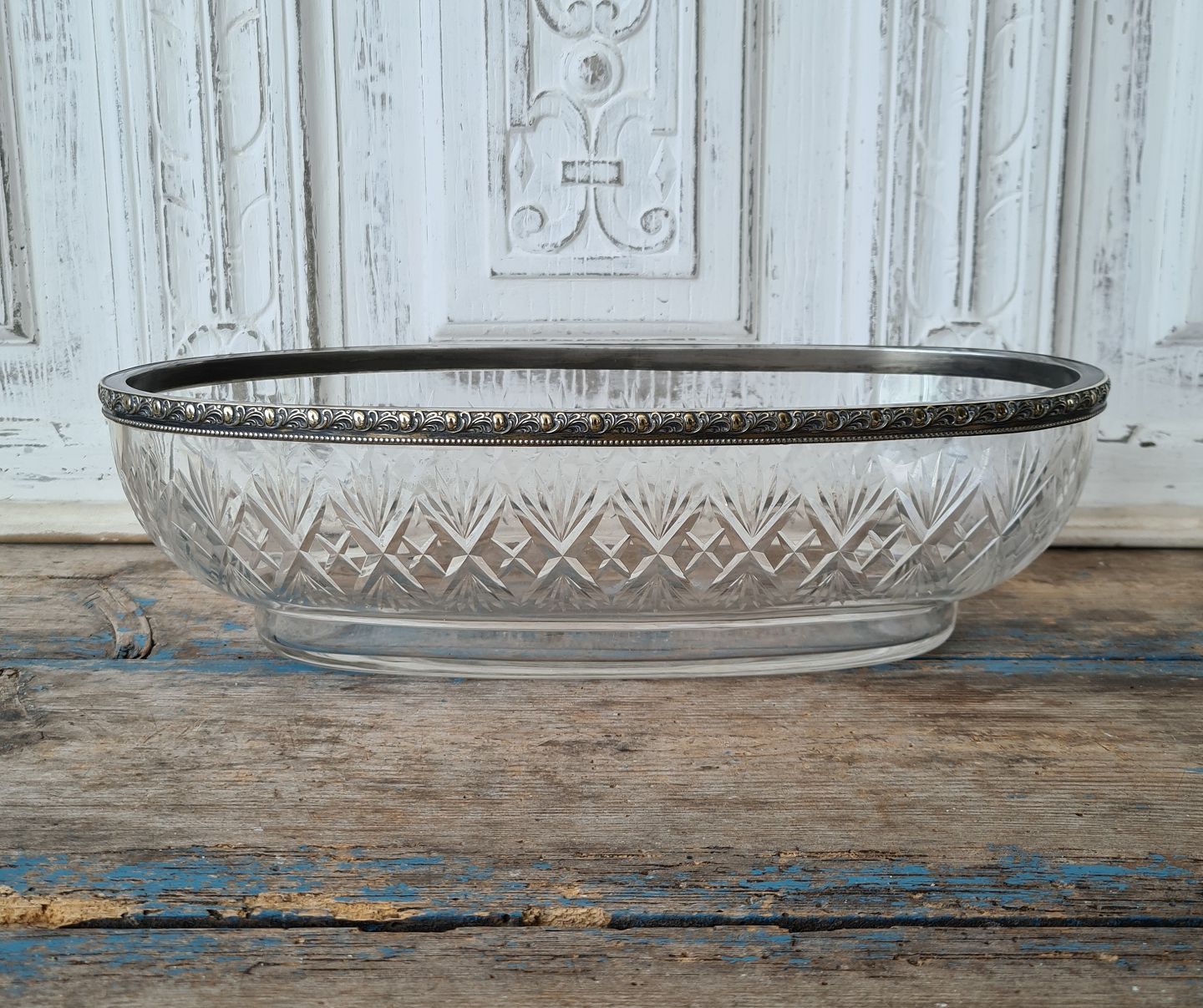 Stor jardiniere af slebet krystal med forsølvet kant