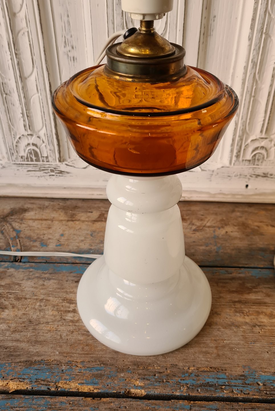 Smuk 1800tals opaline lampe med oliebeholder i rav farvet glas.