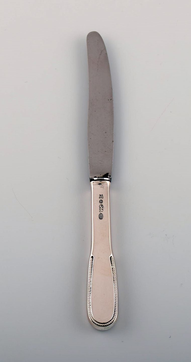 Fire Evald Nielsen nummer 14 små frokostknive i hammerslået sølv (830) og rustfrit stål. 1920'erne.