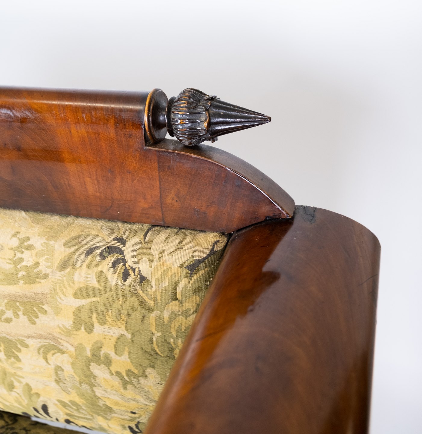Sen empire sofa af mahogni og polstret med lyst stof, i flot antik stand fra 1840erne.