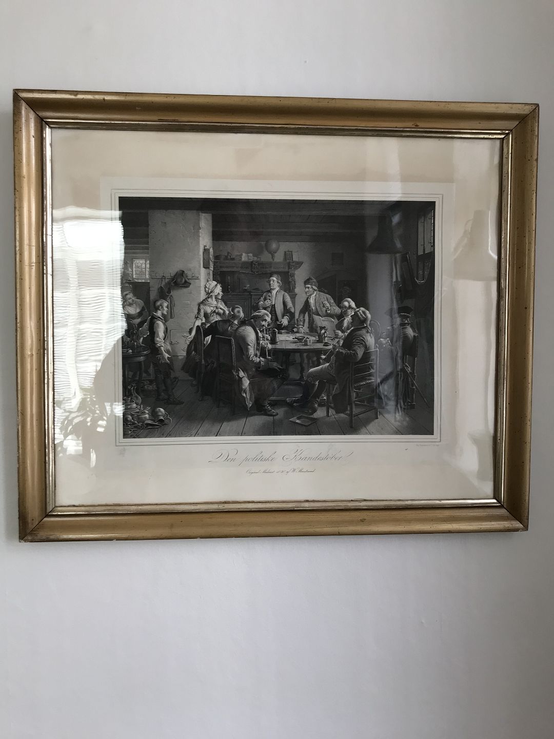 Den politiske kandestøber. Em. Bæretzen og co efter W. Marstrand. Mål med ramme. 54 x 64 cm. Guldsølv ramme.