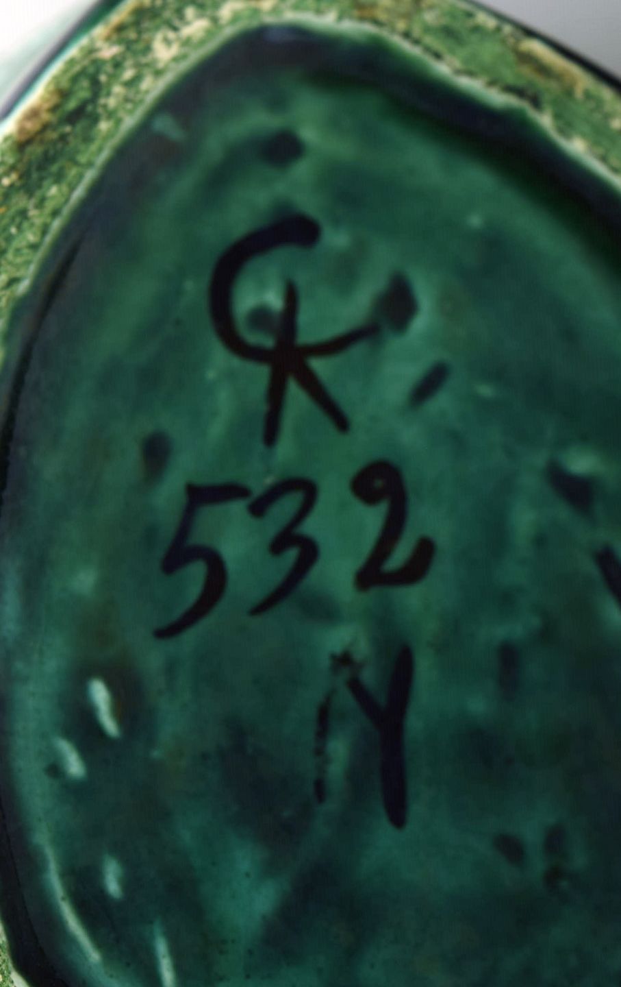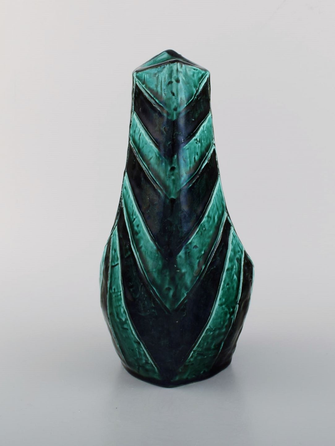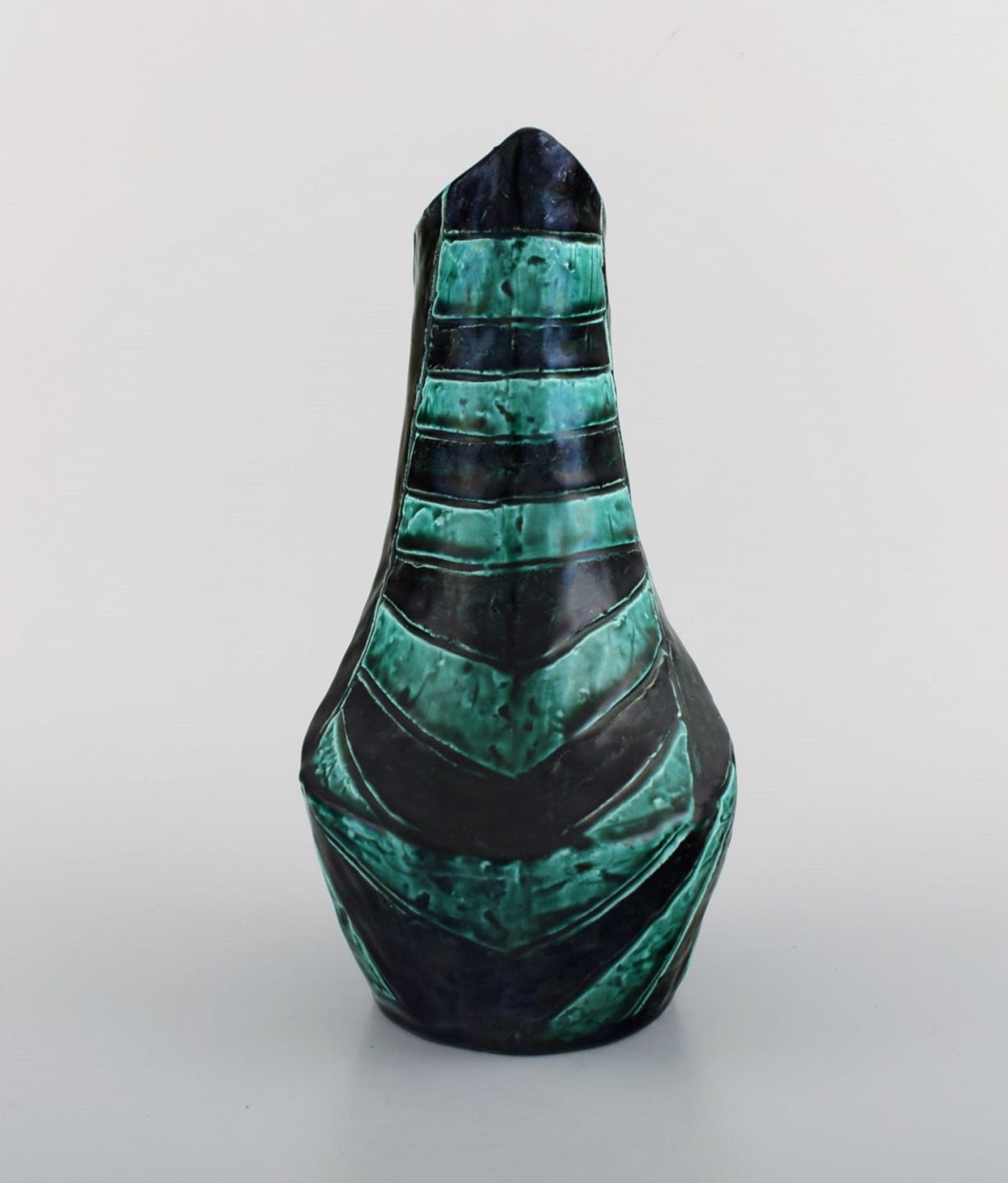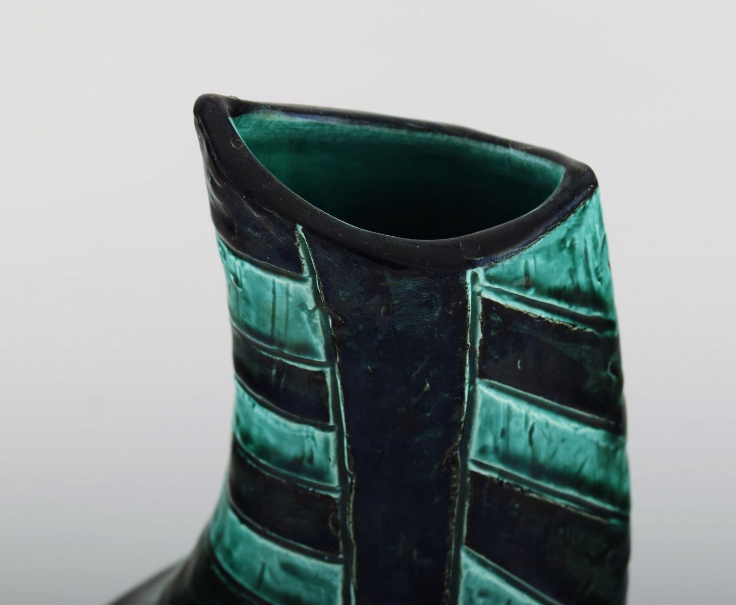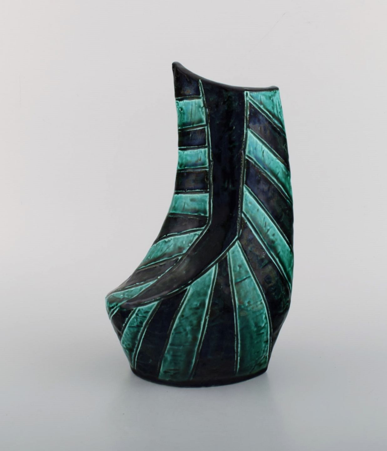 European studio ceramicist. Unique vase in glazed ceramics. Beautiful glaze in shades of blue and green. Striped design, 1960s / 70s.