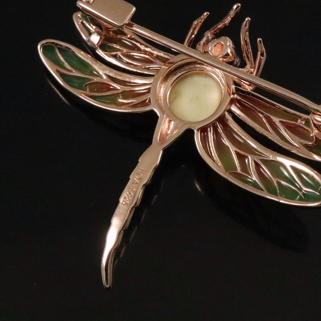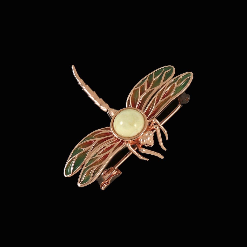 House of Amber. Broche i rosaforgyldt sterling sølv med emalje og rav.