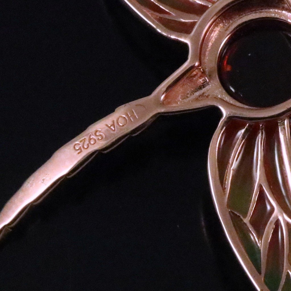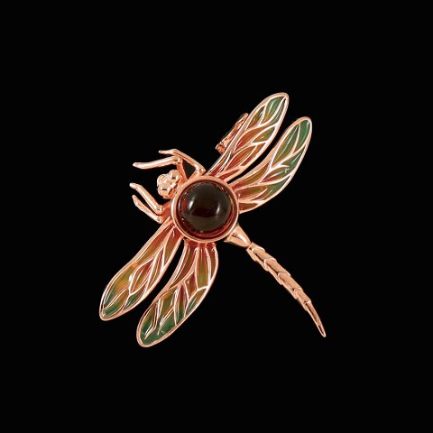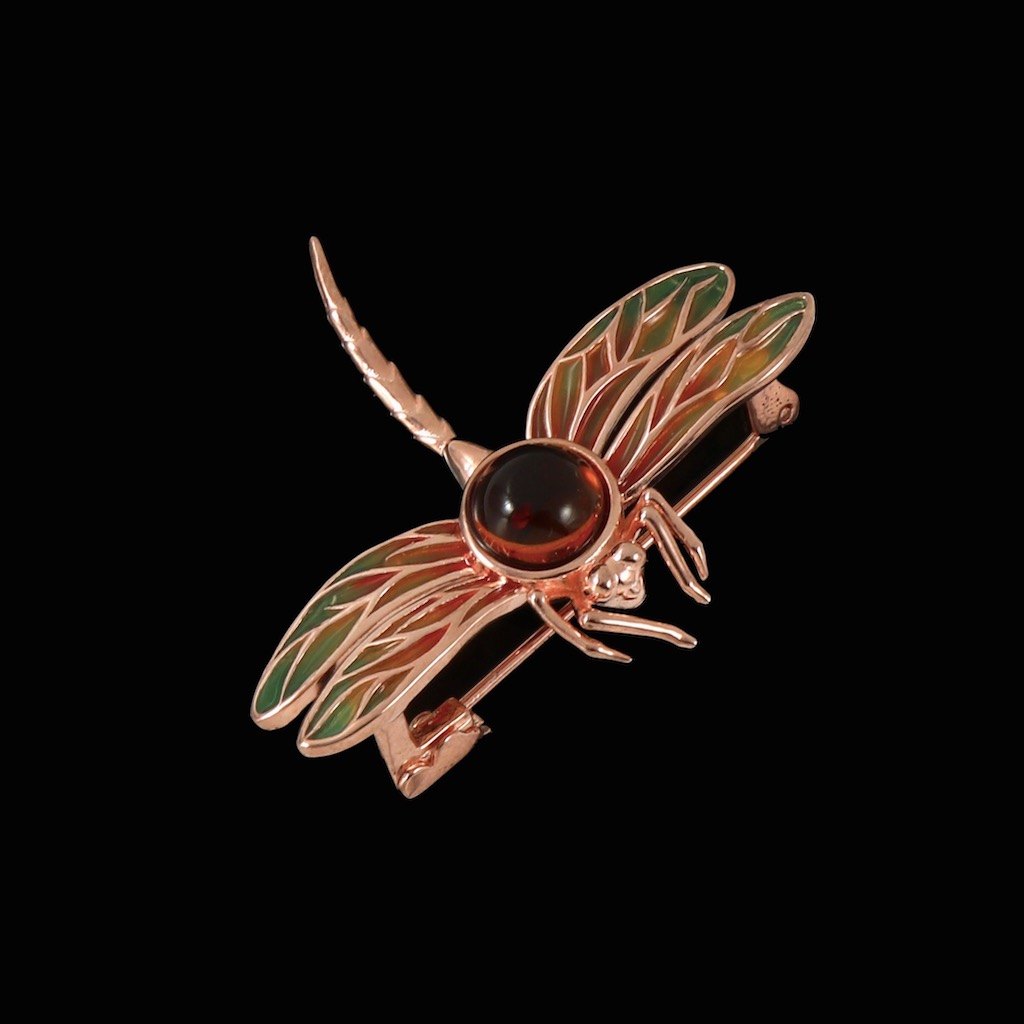 House of Amber. Broche i rosaforgyldt sterling sølv med emalje og rav.