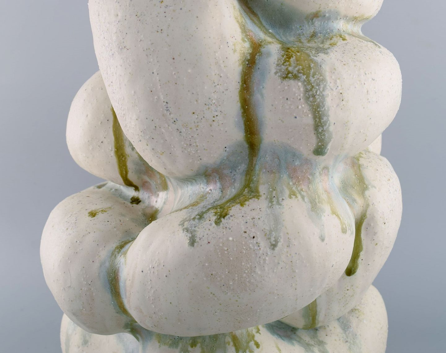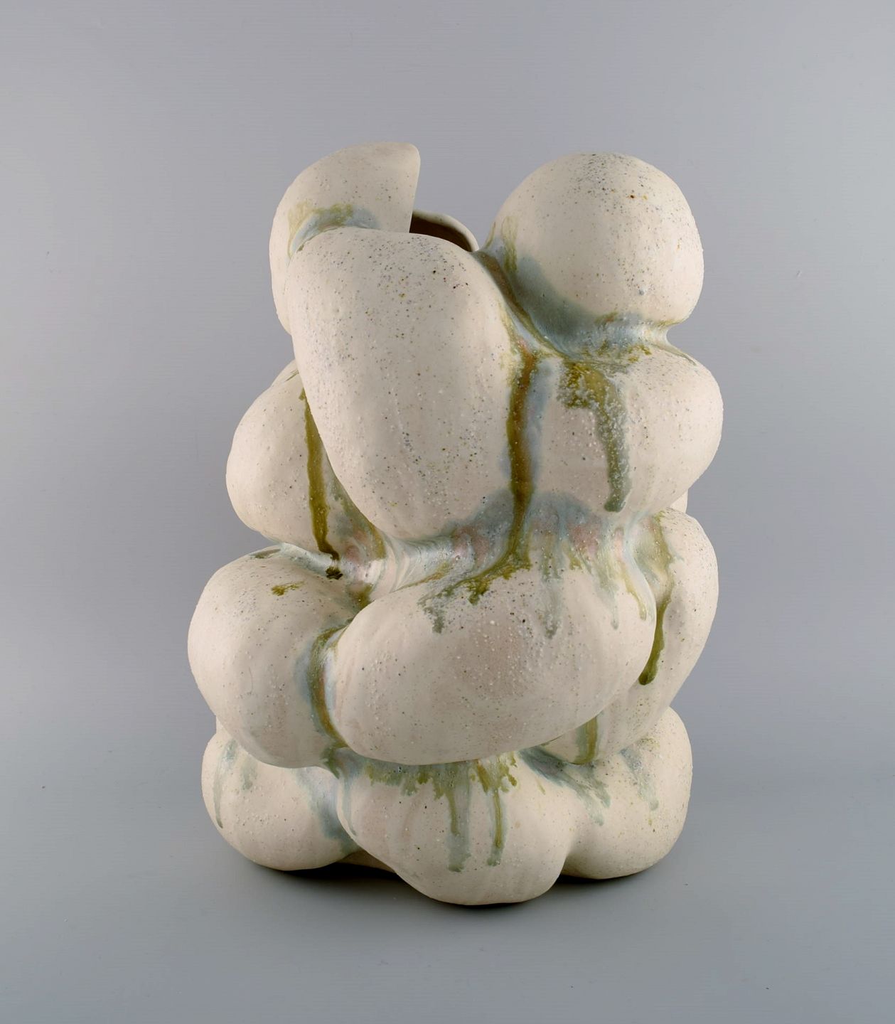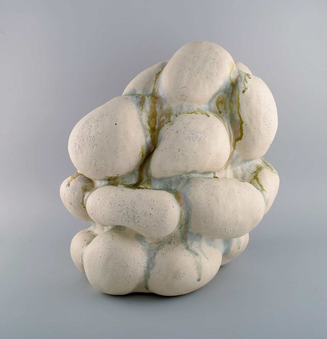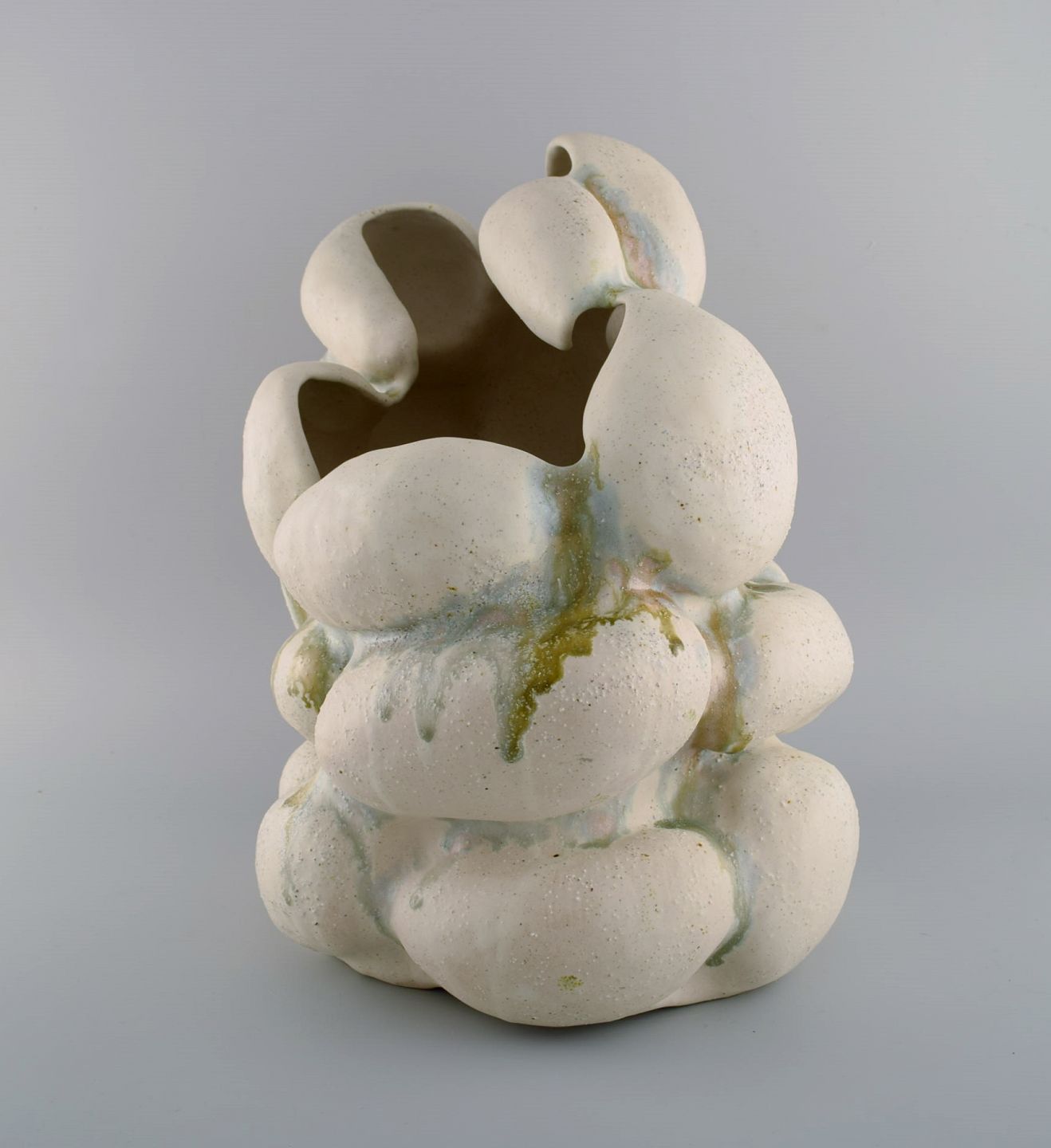 Christina Muff, dansk samtidskeramiker (f. 1971). Monumental skulpturel vase af stenstøjsler. Denne skulptur er glaseret med cremehvid glasur tilføjet mineraler fra Danmark.