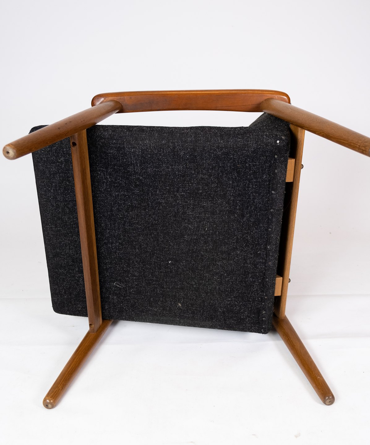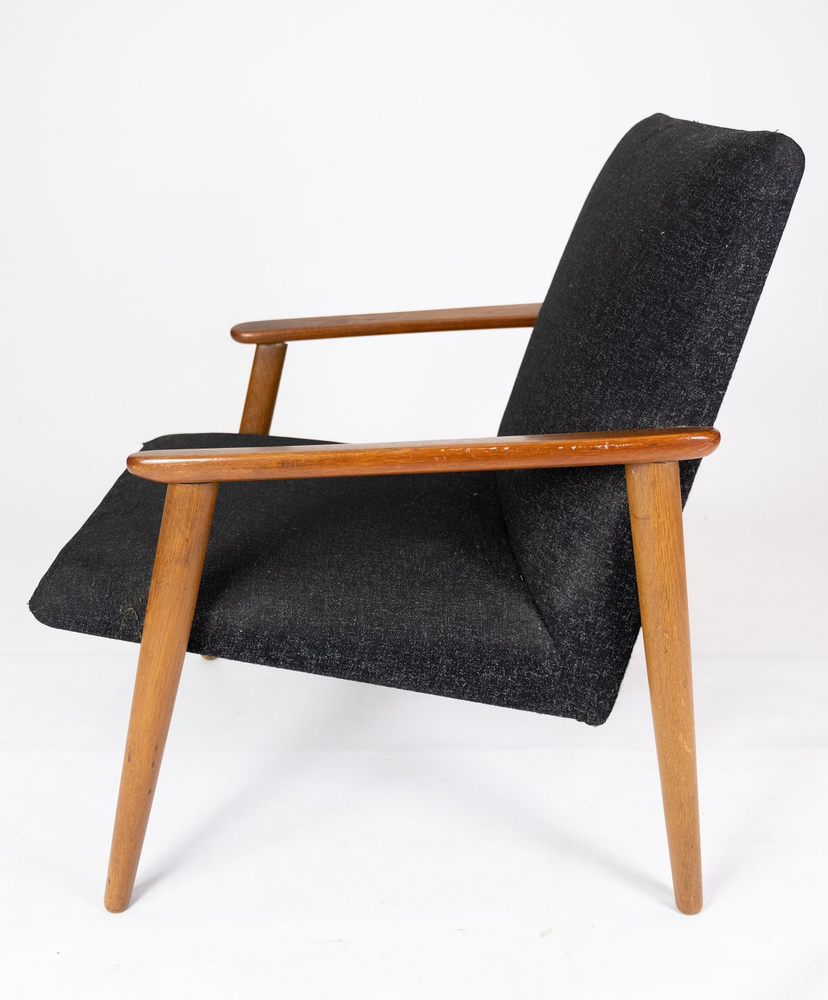 Lænestol med skammel i teak og mørkt uldstof af dansk design fra 1960erne.