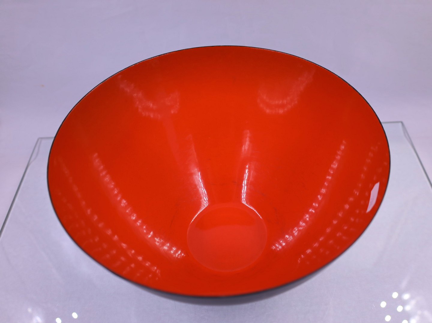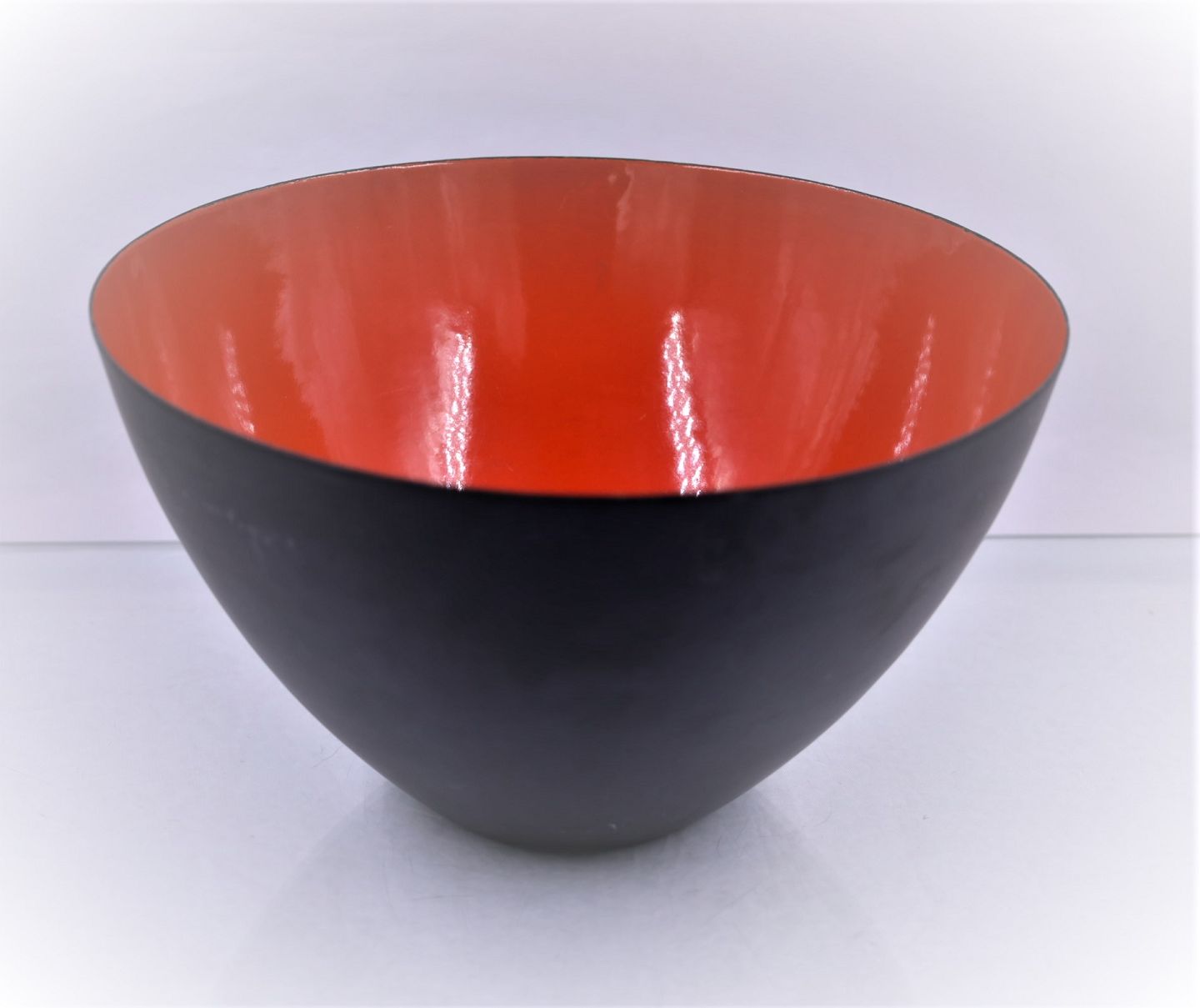 Herbert Krenchel. Original rød krenit skål, skålens facon er konkav. Skålen er af sort metal med rød emalje.
