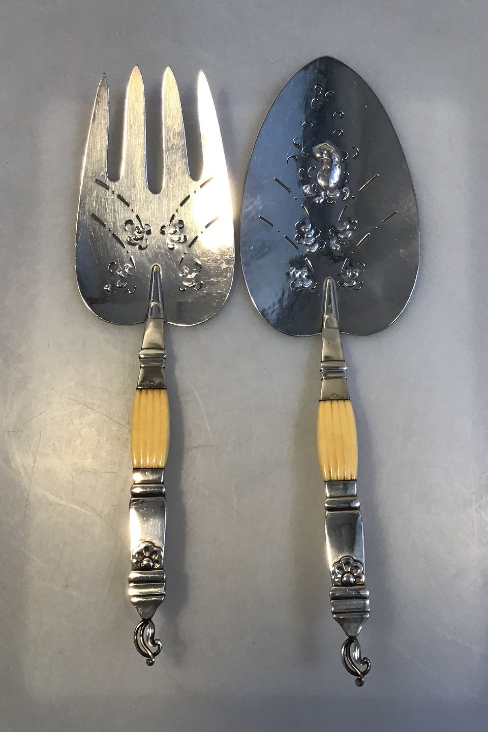 Georg Jensen Sølv Fiske Serveringssæt (1927) Delvis benskaft Blomster dekoration Måler Fiskespade 27.5 cm Fiskegaffel 26 cm