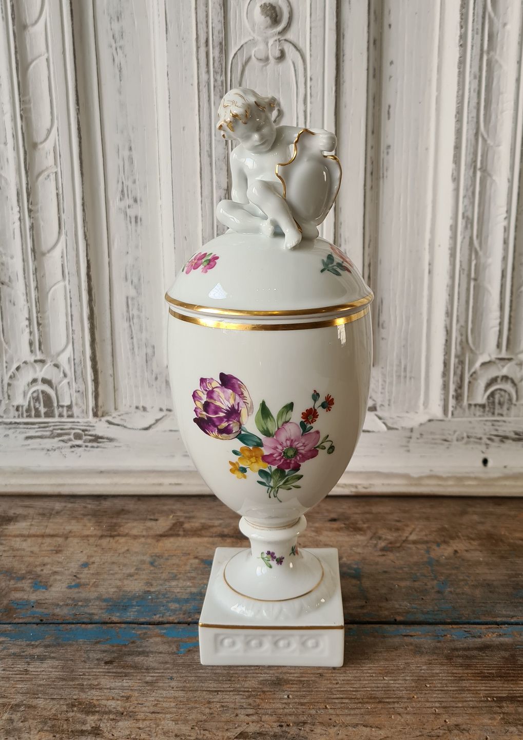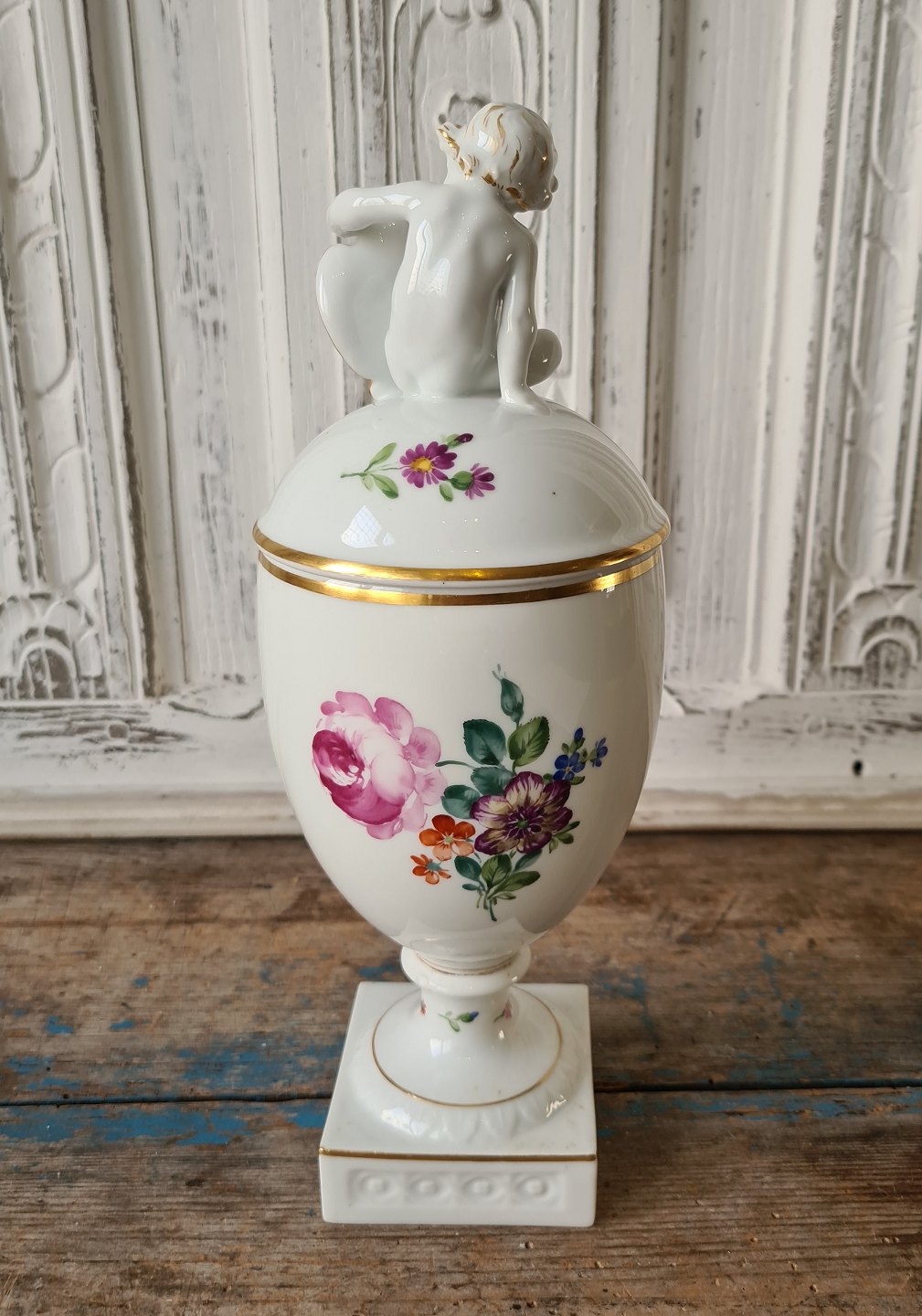 Royal Copenhagen Saksisk Blomst Let - lågpokal med putti på låget