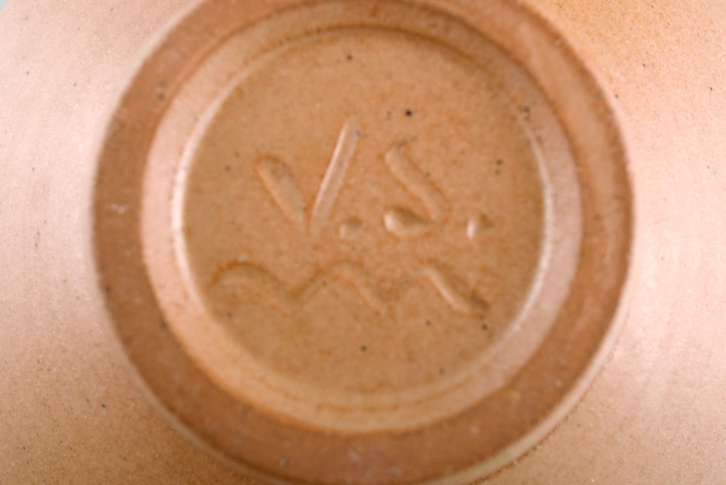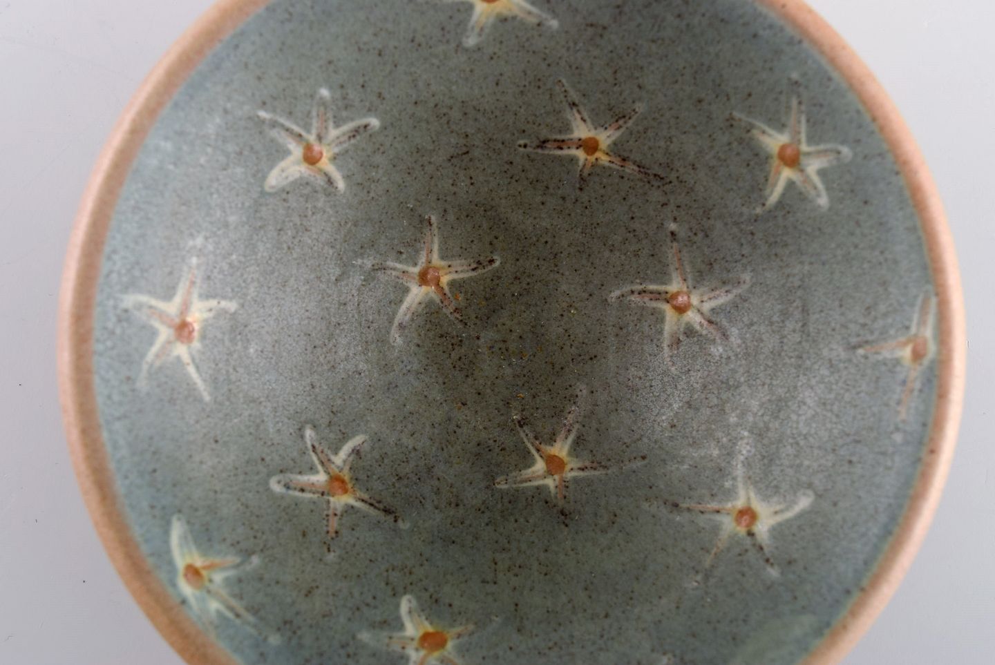 Europæisk studio keramiker. Unika skål på fod i håndmalet glaseret stentøj. Sent 1900-tallet.