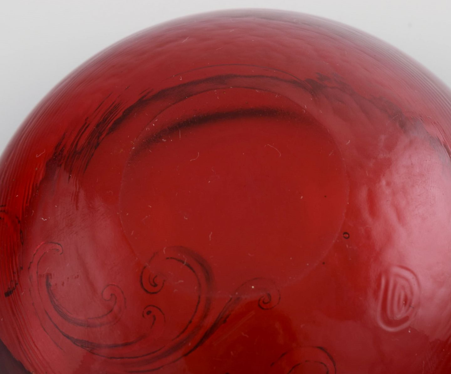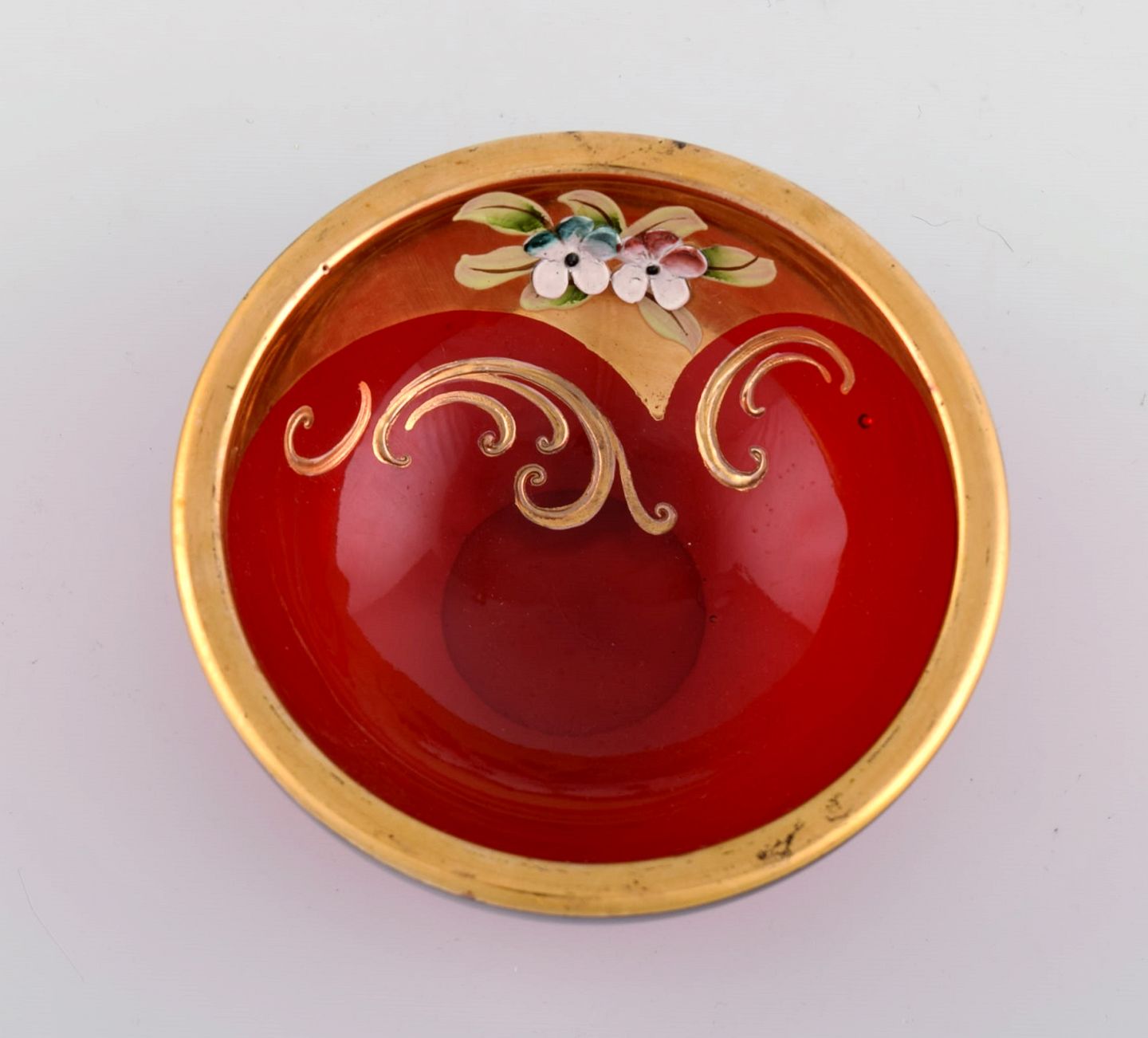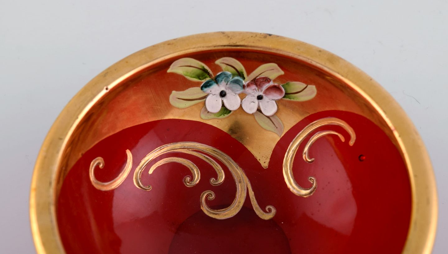 Skål i rødt mundblæst kunstglas med håndmalede blomster og gulddekoration. 1930/40'erne.
