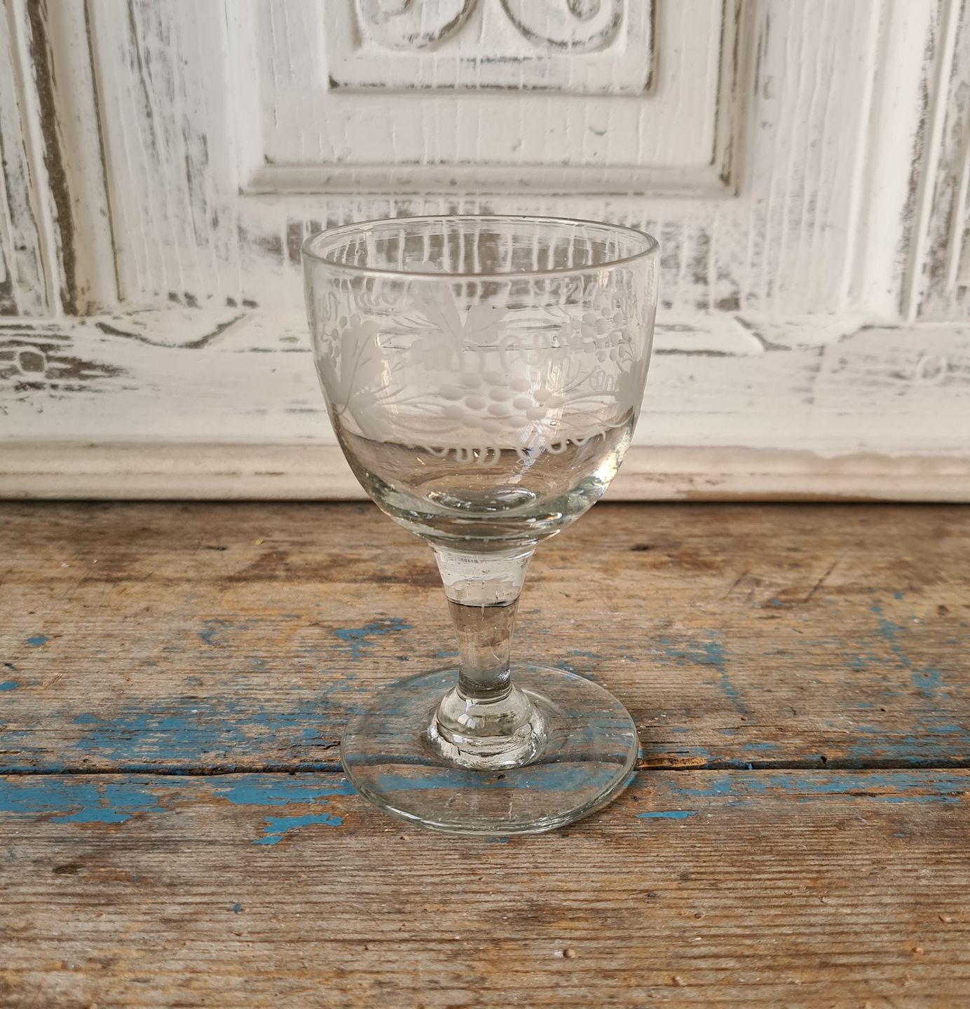 Holmegaard spidsglas dekoreret med drueklaser, vinløv og fangtråde