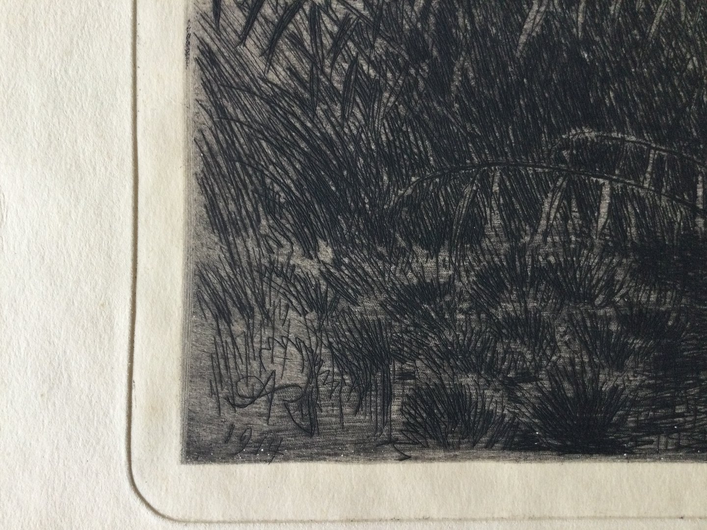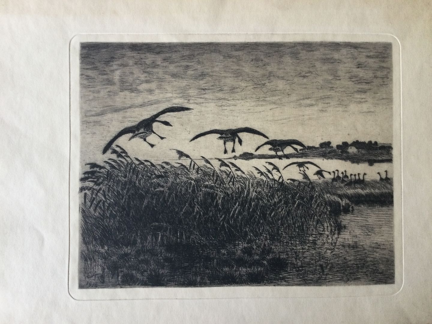 Radering af Aage Roose - Flyvende gæs over sø 1914.