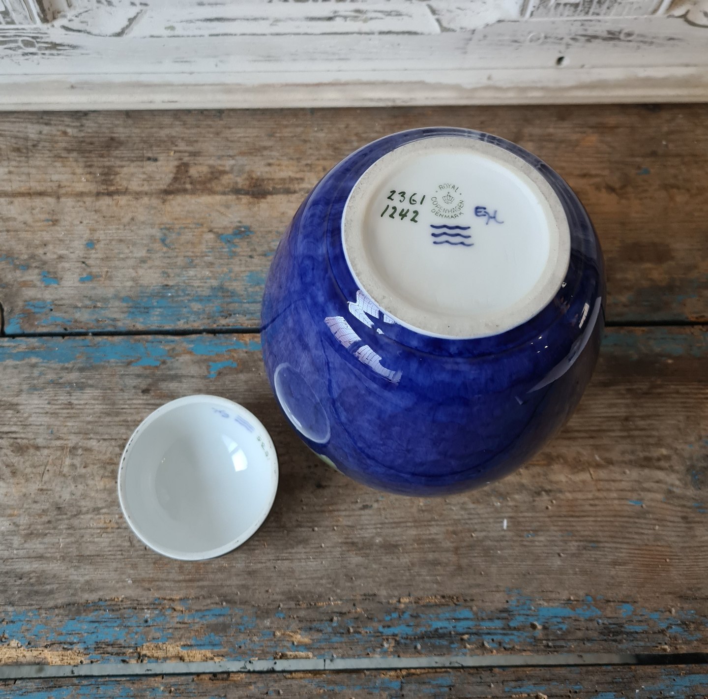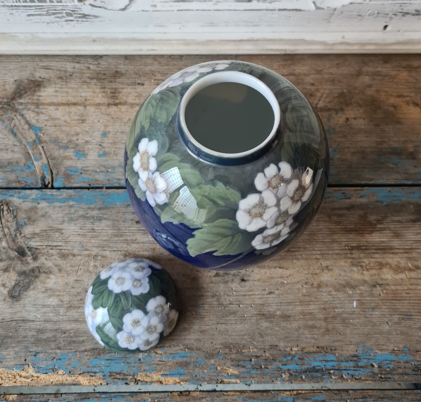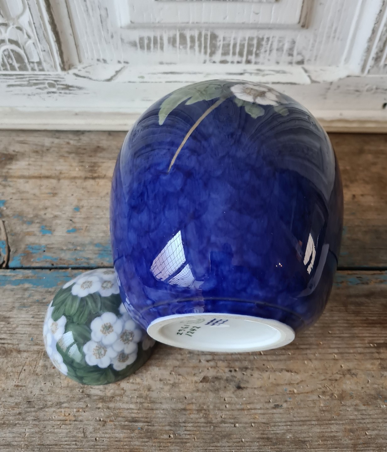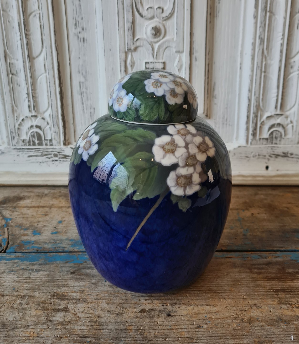 Royal Copenhagen Art Nouveau lågvase dekoreret med jordbærblomster, jordbær løv på blå bund. Bemalet af Else Hasselriis no. 2361/1242