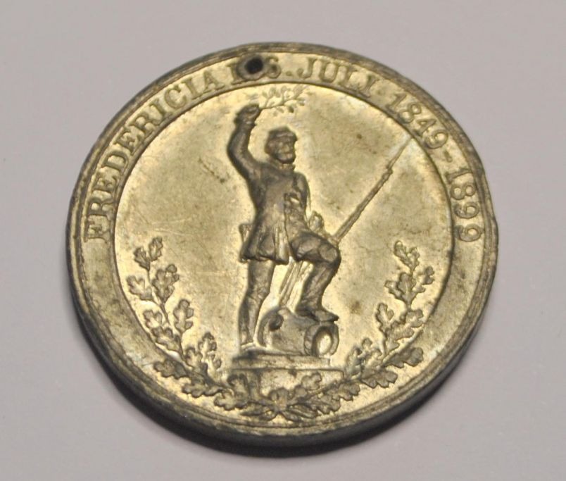 Erindrings tegn (medalje) , Fredericia - Fæstnings- Forsvar, 1849 - 1899. Danmark. Aluminimum. Dia.: 3,5 cm. Med boret hul.