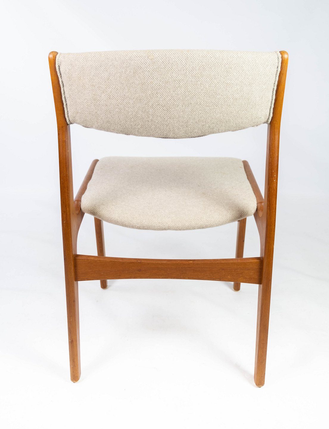 Sæt af spisestuestole i teak og polstret med lyst stof, designet af Erik Buch fra 1960erne. Stolene er i flot brugt stand.