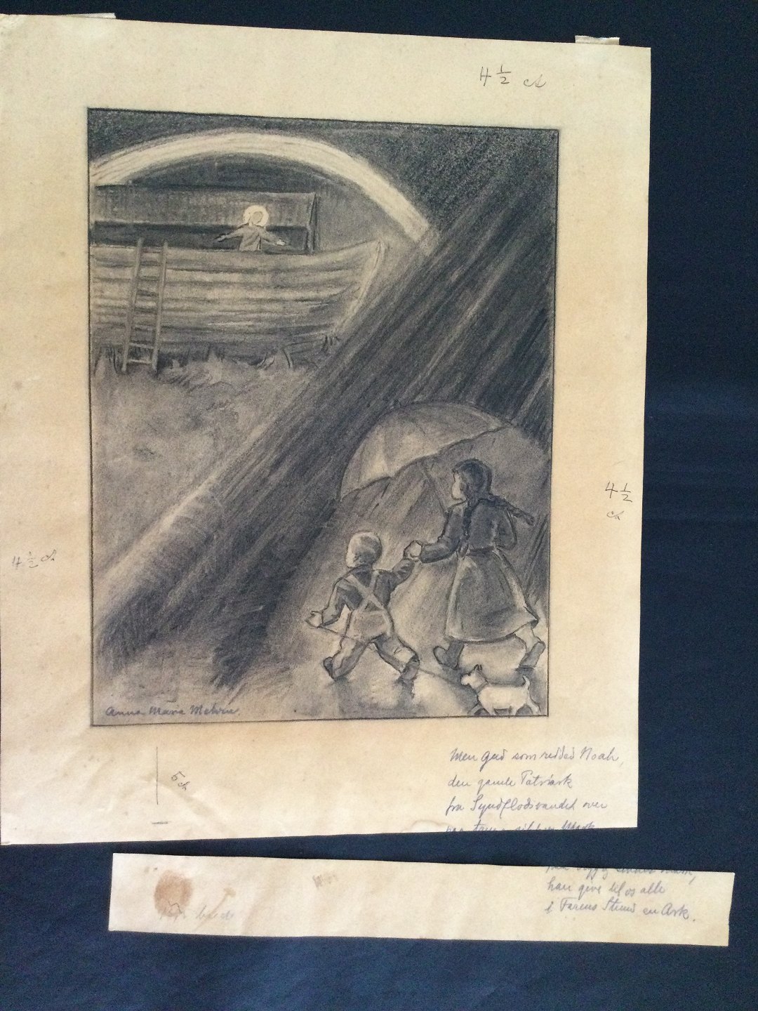 Tekst: "Men Gud som redder Noah, den gamle Patriark fra Syndflods vandet over paa tryk og sikker mark, Han give til os alle i Faderens navn en ark".