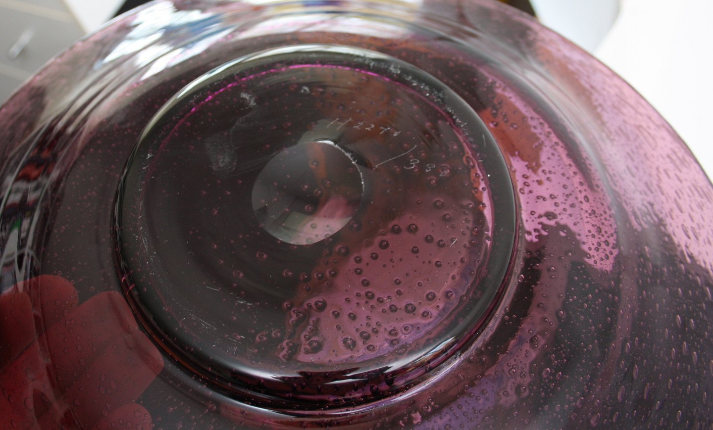 Boda, Sweden, Lilla glasfad med luftbobler. Designet af Erik Höglund i 1950/1960'erne. Signeret H 2270/330. Diameter 32 cm. Højde 4,5 cm. Flot stand. Pris: 450 kr.