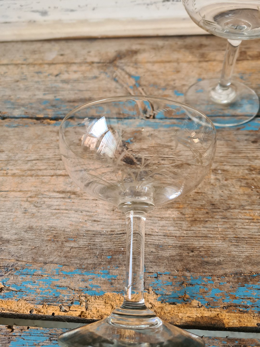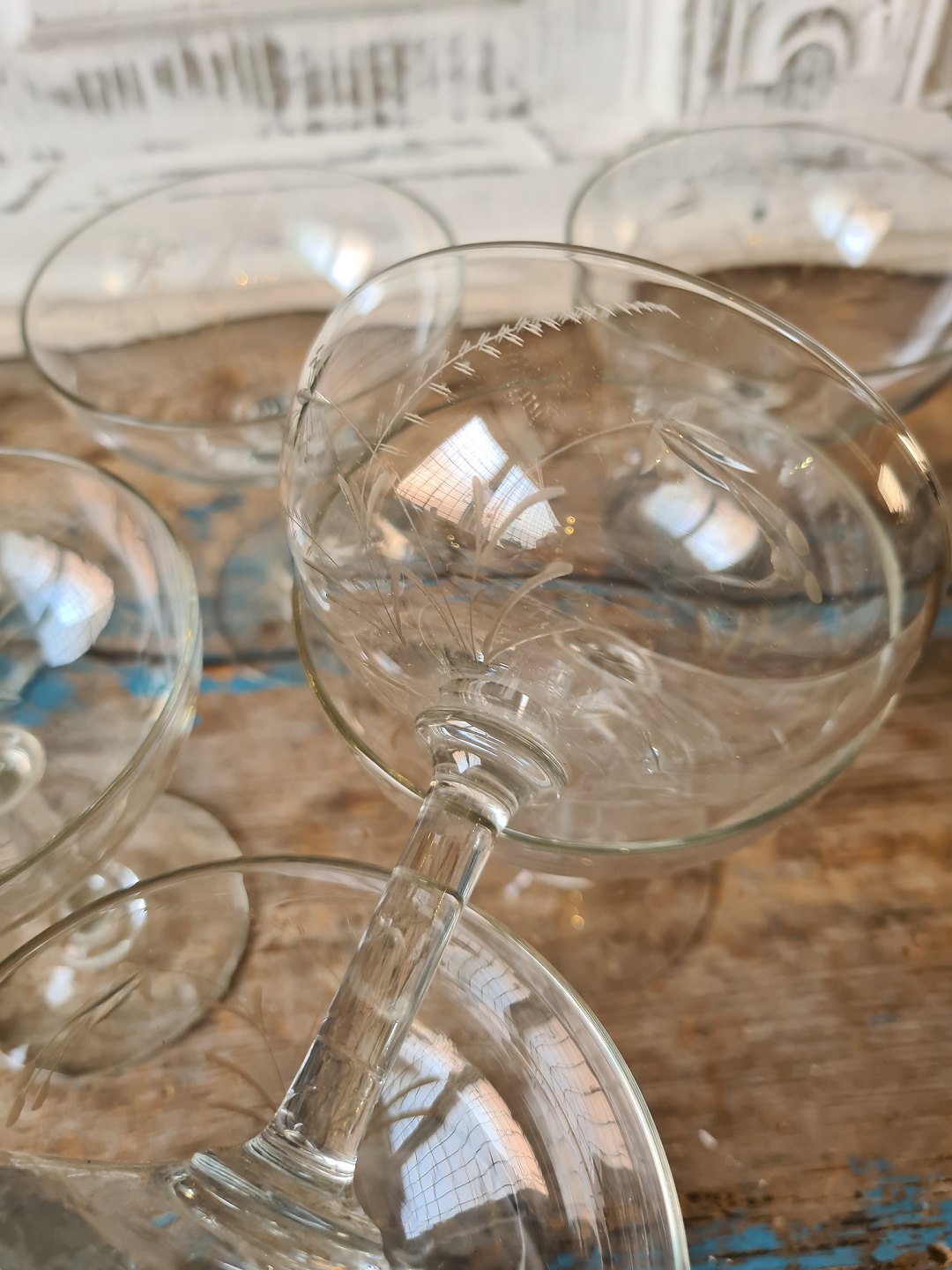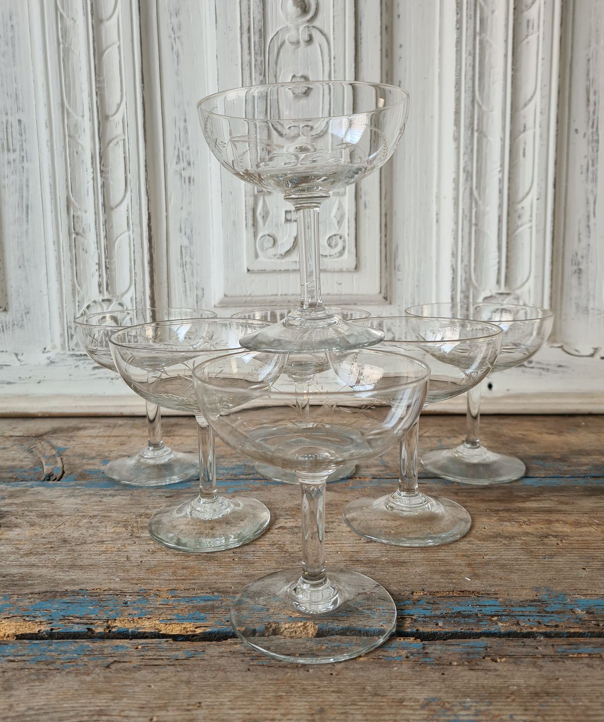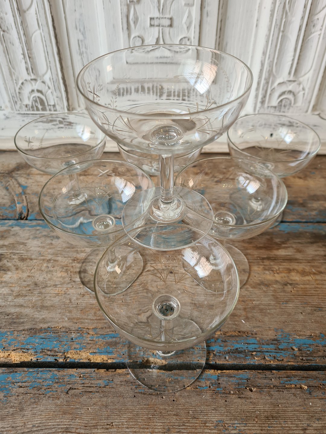 Sæt på 7 franske champagneskåle dekoreret med fine slibninger fra 1940érne.