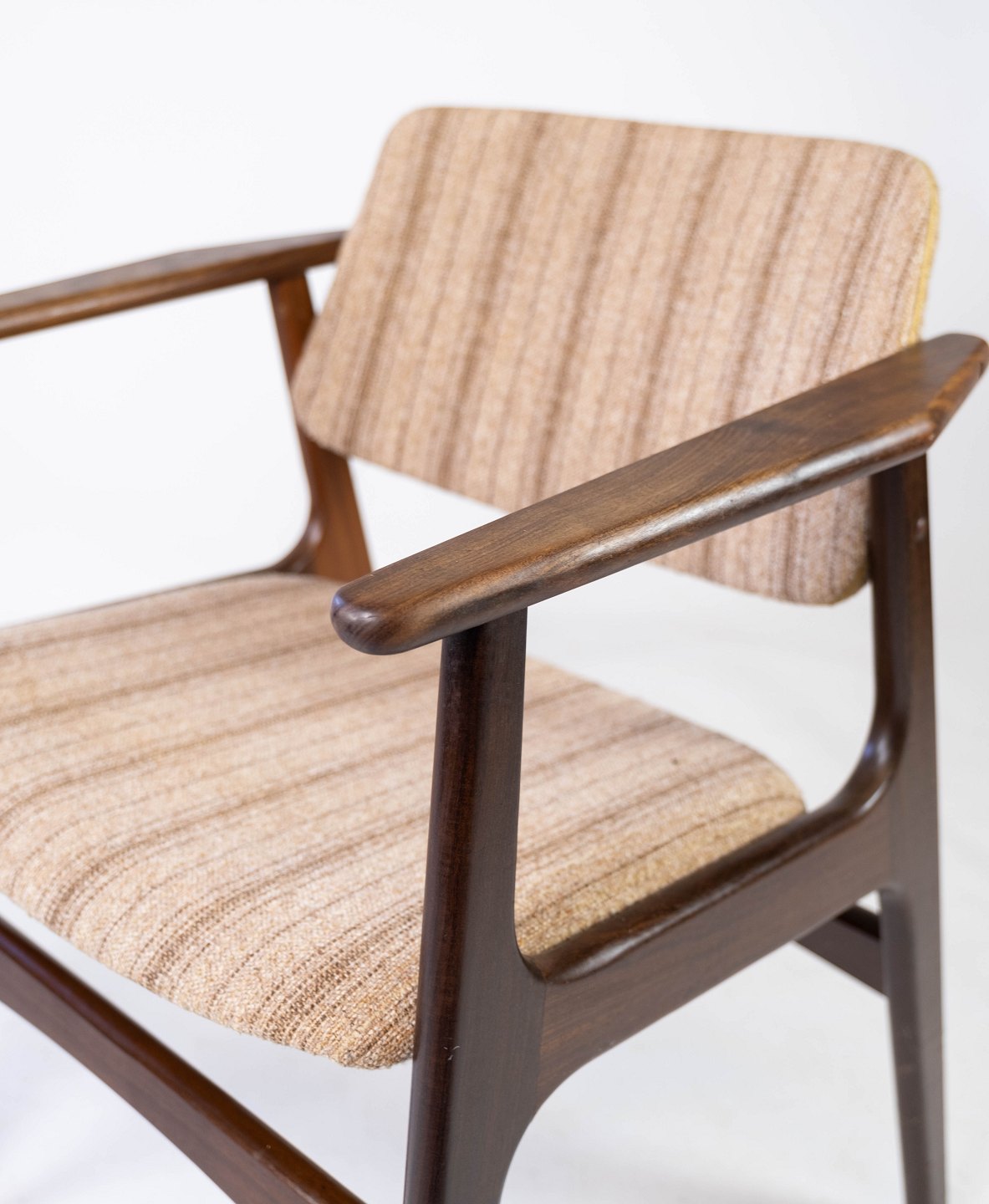 Denne spisestuestol i teak, kendt som model "Lene", er et smukt eksempel på dansk møbeldesign fra 1960'erne. Stolen er polstret med et elegant stribet stof, der tilføjer både komfort og æstetik til enhver spiseplads.